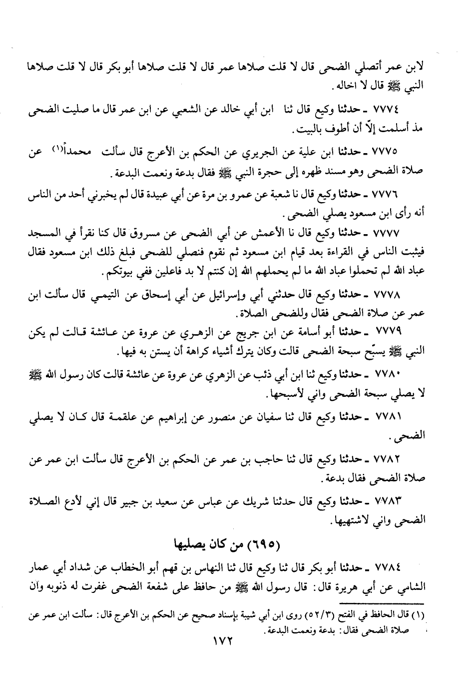 7774 - حَدَّثَنَا وَكِيعٌ، قَالَ: ثنا ابْنُ خَالِدٍ، عَنِ الشَّعْبِيِّ، عَنِ ابْنِ عُمَرَ، قَالَ: «§مَا صَلَّيْتُ الضُّحَى مُنذْ أَسْلَمْتُ، إِلَّا أَنْ أَطُوفَ بِالْبَيْتِ»