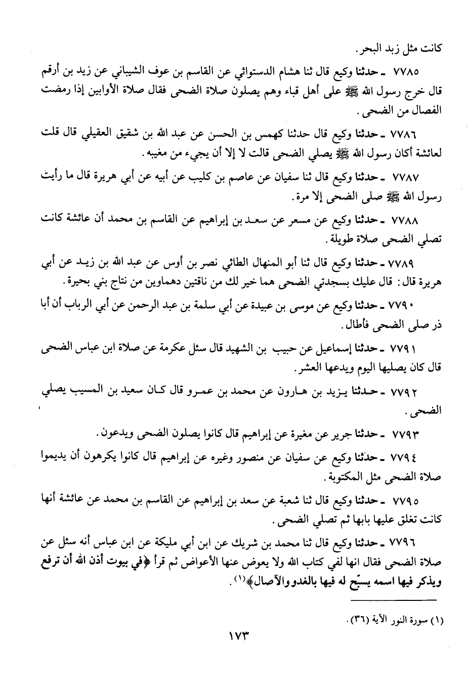 7796 - حَدَّثَنَا وَكِيعٌ، قَالَ: ثنا مُحَمَّدُ بْنُ شَرِيكٍ، عَنِ ابْنِ أَبِي مُلَيْكَةَ، عَنِ ابْنِ عَبَّاسٍ: أَنَّهُ سُئِلَ عَنْ صَلَاةِ الضُّحَى، فَقَالَ: «§إِنَّهَا لَفِي كِتَابِ اللَّهِ، وَلَا يُعَوِّضُ عَنْهَا الْأَعْوَاضُ» ثُمَّ قَرَأَ: {فِي بُيُوتٍ أَذِنَ اللَّهُ أَنْ تُرْفَعَ وَيُذْكَرَ فِيهَا اسْمُهُ يُسَبِّحُ لَهُ فِيهَا بِالْغُدُوِّ وَالْآصَالِ} [النور: 36]