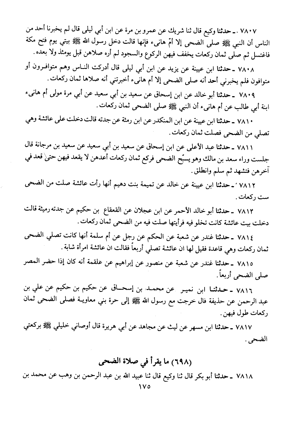 7807 - حَدَّثَنَا وَكِيعٌ، قَالَ: ثنا شَرِيكٌ، عَنْ عَمْرِو بْنِ مُرَّةَ، عَنِ ابْنِ أَبِي لَيْلَى، قَالَ: لَمْ يُخْبِرْنَا أَحَدٌ مِنَ النَّاسِ أَنَّ النَّبِيَّ صَلَّى اللهُ عَلَيْهِ وَسَلَّمَ صَلَّى الضُّحَى إِلَّا أُمَّ هَانِئٍ، فَإِنَّهَا قَالَتْ: «دَخَلَ رَسُولُ اللَّهِ صَلَّى اللهُ عَلَيْهِ وَسَلَّمَ بَيْتِي يَوْمَ فَتْحِ مَكَّةَ، فَاغْتَسَلَ ثُمَّ §صَلَّى ثَمَانِ رَكَعَاتٍ يُخَفِّفُ فِيهِنَّ الرُّكُوعَ وَالسُّجُودَ، لَمْ أَرَهُ صَلَّاهُنَّ قَبْلَ يَوْمَئِذٍ وَلَا بَعْدَهُ»
