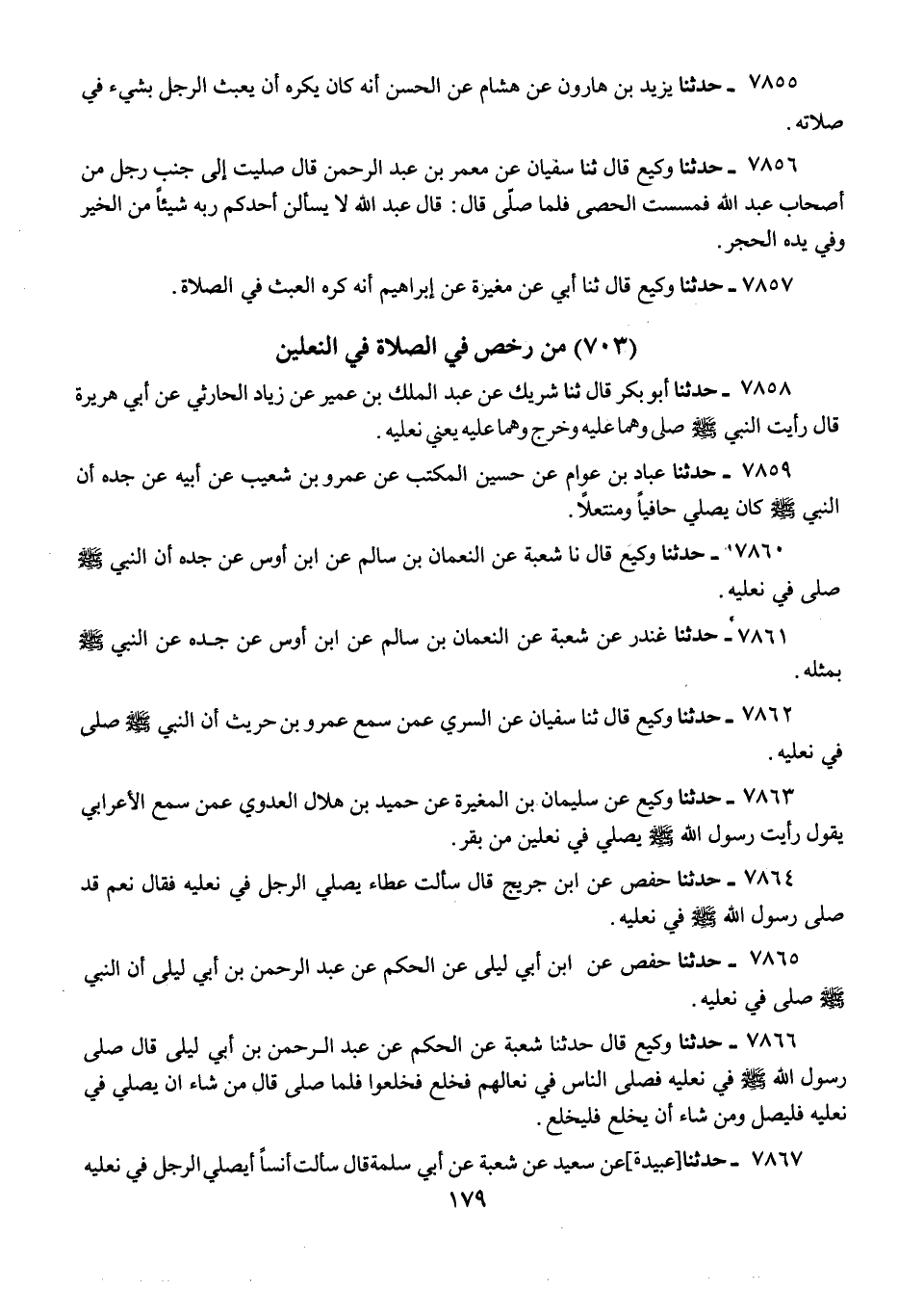 7862 - حَدَّثَنَا وَكِيعٌ، قَالَ: ثنا سُفْيَانُ، عَنِ السَّرِيِّ، عَمَّنْ سَمِعَ عَمْرَو بْنَ حُرَيْثٍ، «أَنَّ النَّبِيَّ صَلَّى اللهُ عَلَيْهِ وَسَلَّمَ §صَلَّى فِي نَعْلَيْهِ»