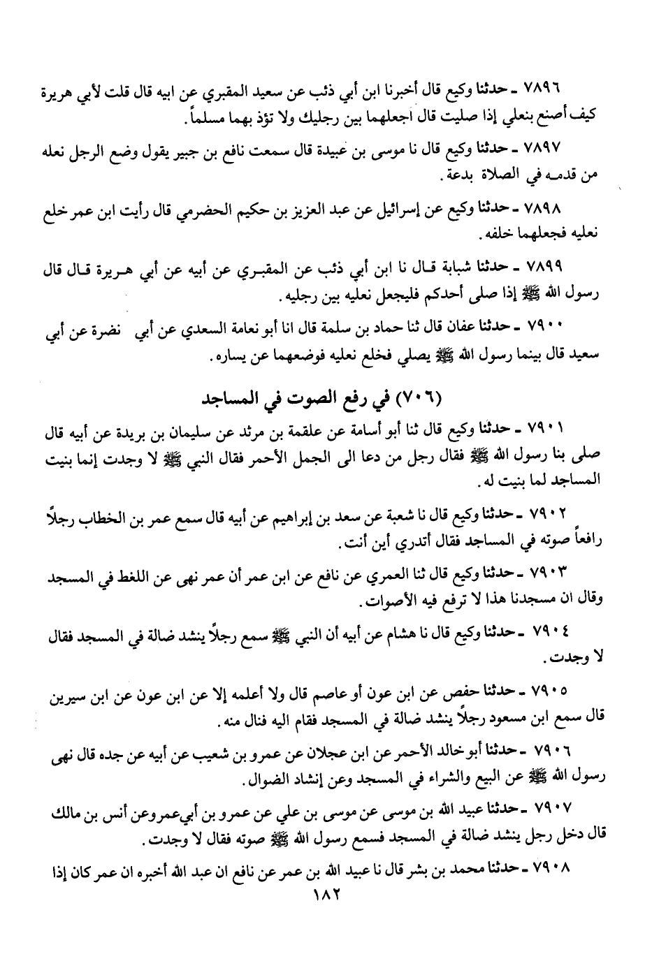 7902 - حَدَّثَنَا وَكِيعٌ، قَالَ: نا شُعْبَةُ، عَنْ سَعْدِ بْنِ إِبْرَاهِيمَ، عَنْ أَبِيهِ، قَالَ: سَمِعَ عُمَرُ بْنُ الْخَطَّابِ رَجُلًا رَافِعًا صَوْتَهُ فِي الْمَسْجِدِ، فَقَالَ: «§أَتَدْرِي أَيْنَ أَنْتَ؟»