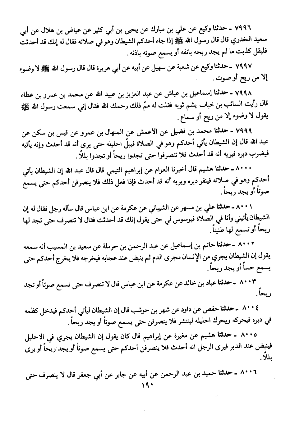 8001 - حَدَّثَنَا عَلِيُّ بْنُ مُسْهِرٍ، عَنِ الشَّيْبَانِيِّ، عَنْ عِكْرِمَةَ، عَنِ ابْنِ عَبَّاسٍ، قَالَ: سَأَلَهُ رَجُلٌ فَقَالَ لَهُ: إِنَّ الشَّيْطَانَ يَأْتِينِي وَأَنَا فِي الصَّلَاةِ، فَيُوَسْوِسُ لِي حَتَّى يَقُولَ: إِنَّكَ قَدْ أَحْدَثْتَ، فَقَالَ: «§لَا تَنْصَرِفْ حَتَّى تَجِدَ لَهَا رِيحًا أَوْ تَسْمَعَ لَهَا طَنِينًا»