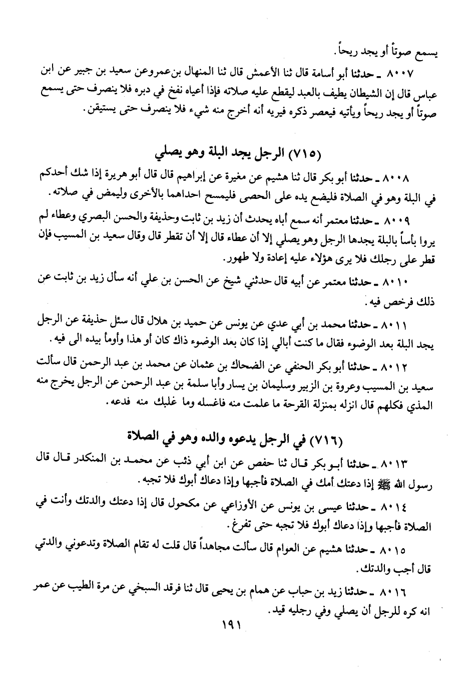 8007 - حَدَّثَنَا أَبُو أُسَامَةَ، قَالَ: ثنا الْأَعْمَشُ، قَالَ: ثنا الْمِنْهَالُ بْنُ عَمْرٍو، عَنْ سَعِيدِ بْنِ جُبَيْرٍ، عَنِ ابْنِ عَبَّاسٍ، قَالَ: «إِنَّ §الشَّيْطَانَ يُطِيفُ بِالْعَبْدِ لِيَقْطَعَ عَلَيْهِ صَلَاتَهُ، فَإِذَا أَعْيَاهُ نَفَخَ فِي دُبُرِهِ، فَلَا يَنْصَرِفْ حَتَّى يَسْمَعَ صَوْتًا أَوْ يَجِدَ رِيحًا، وَيَأْتِيهِ فَيَعْصِرُ ذَكَرَهُ فَيُرِيهِ أَنَّهُ أُخْرِجَ مِنْهُ شَيْءٌ، فَلَا يَنْصَرِفْ حَتَّى يَسْتَيْقِنَ»