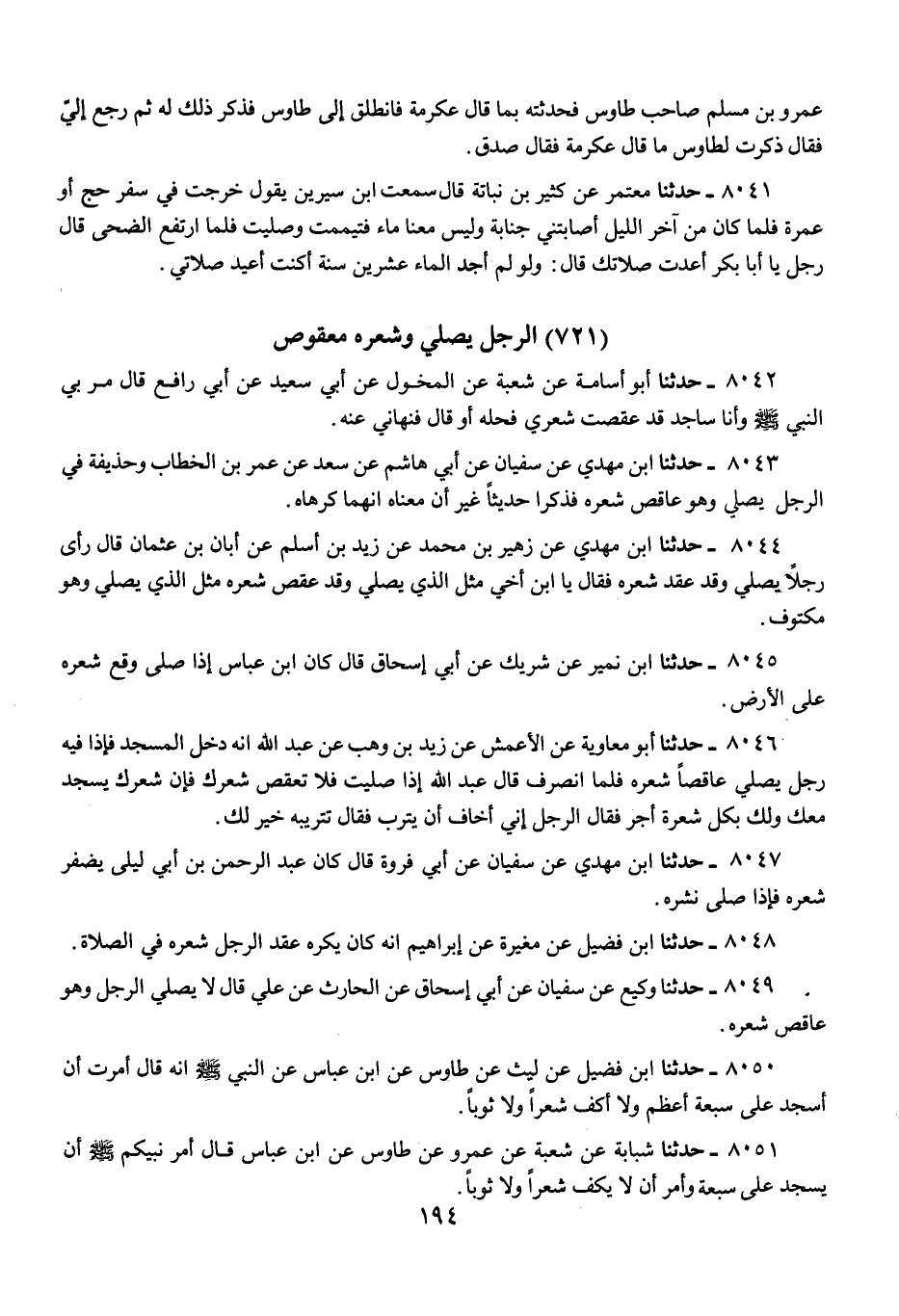 8045 - حَدَّثَنَا ابْنُ نُمَيْرٍ، عَنْ شَرِيكٍ، عَنْ أَبِي إِسْحَاقَ، قَالَ: «كَانَ ابْنُ عَبَّاسٍ §إِذَا صَلَّى وَقَعَ شَعْرُهُ عَلَى الْأَرْضِ»