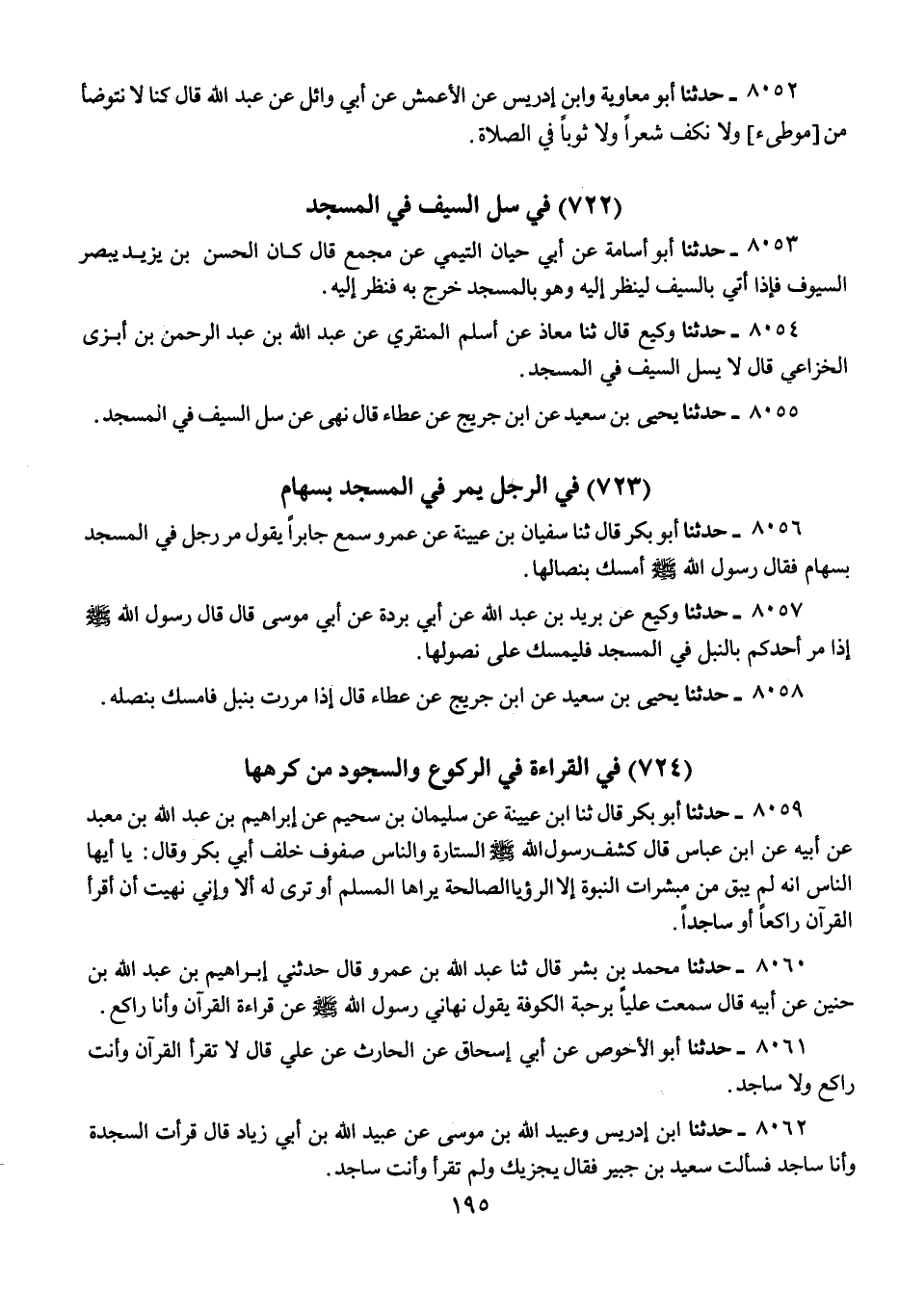8052 - حَدَّثَنَا أَبُو مُعَاوِيَةَ، وَابْنُ إِدْرِيسَ، عَنِ الْأَعْمَشِ، عَنْ أَبِي وَائِلٍ، عَنْ عَبْدِ اللَّهِ قَالَ: «كُنَّا §لَا نَتَوَضَّأُ مِنْ مَوْطِئٍ وَلَا نَكُفُّ شَعْرًا وَلَا ثَوْبًا فِي الصَّلَاةِ»