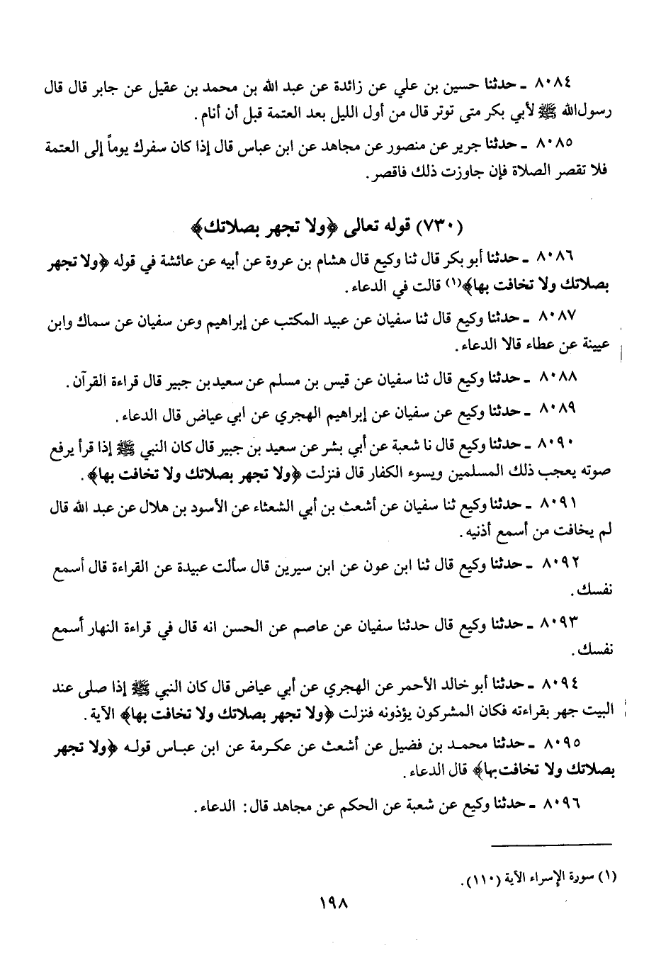8086 - حَدَّثَنَا أَبُو بَكْرٍ قَالَ: ثنا وَكِيعٌ، قَالَ: ثنا هِشَامُ بْنُ عُرْوَةَ، عَنْ أَبِيهِ، عَنْ عَائِشَةَ فِي قَوْلِهِ: {وَلَا تَجْهَرْ بِصَلَاتِكَ وَلَا تُخَافِتْ بِهَا} [الإسراء: 110] قَالَتْ: «§فِي الدُّعَاءِ»