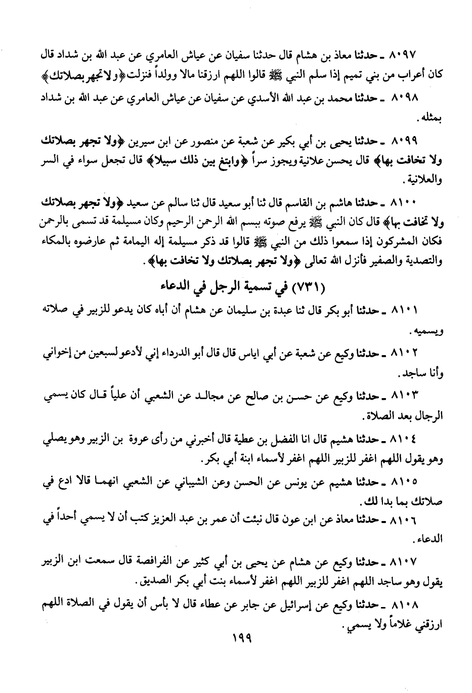 8103 - حَدَّثَنَا وَكِيعٌ، عَنْ حُسَيْنِ بْنِ صَالِحٍ، عَنْ مُجَالِدٍ، عَنِ الشَّعْبِيِّ، أَنَّ عَلِيًّا قَالَ: «كَانَ §يُسَمِّي الرِّجَالَ بَعْدَ الصَّلَاةِ»
