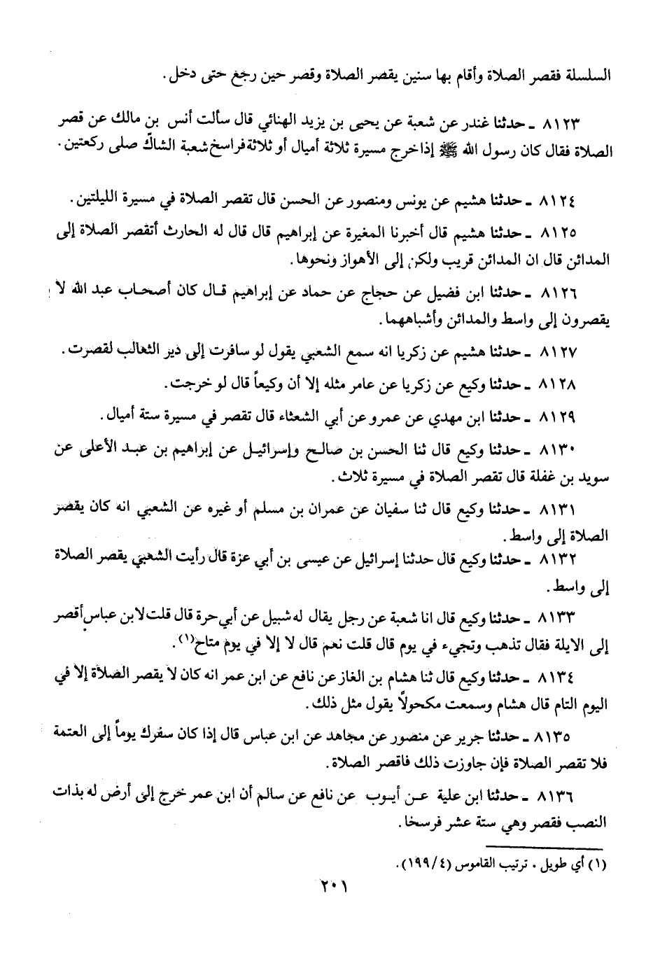 8131 - حَدَّثَنَا وَكِيعٌ، قَالَ: ثنا سُفْيَانُ، عَنْ عِمْرَانَ بْنِ مُسْلِمٍ، أَوْ غَيْرِهِ، عَنِ الشَّعْبِيِّ «أَنَّهُ كَانَ §يَقْصُرُ الصَّلَاةَ إِلَى وَاسِطٍ»