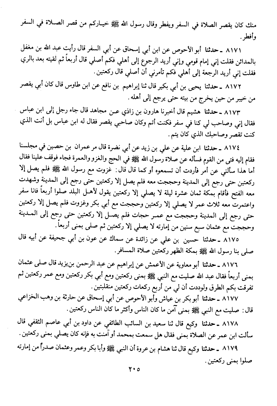 8174 - حَدَّثَنَا ابْنُ عُلَيَّةَ، عَنْ عَلِيِّ بْنِ زَيْدٍ، عَنْ أَبِي نَضْرَةَ قَالَ: مَرَّ عِمْرَانُ بْنُ حُصَيْنٍ فِي مَجْلِسِنَا، فَقَامَ إِلَيْهِ فَتًى مِنَ الْقَوْمِ، فَسَأَلَهُ عَنْ صَلَاةِ رَسُولِ اللَّهِ صَلَّى اللهُ عَلَيْهِ وَسَلَّمَ فِي الْحَجِّ، وَالْغَزْوِ، وَالْعُمْرَةِ؟ فَجَاءَ، فَوَقَفَ عَلَيْنَا، فَقَالَ: أَمَّا هَذَا سَأَلَنِي عَنْ أَمْرٍ فَأَرَدْتُ أَنْ تَسْمَعُوهُ، أَوْ كَمَا قَالَ، قَالَ: §غَزَوْتُ مَعَ رَسُولِ اللَّهِ صَلَّى اللهُ عَلَيْهِ وَسَلَّمَ فَلَمْ يُصَلِّ إِلَّا رَكْعَتَيْنِ حَتَّى رَجَعَ إِلَى الْمَدِينَةِ، وَحَجَجْتُ مَعَهُ فَلَمْ يُصَلِّ إِلَّا رَكْعَتَيْنِ حَتَّى رَجَعَ إِلَى الْمَدِينَةِ، وَشَهِدْتُ مَعَهُ الْفَتْحَ، فَأَقَامَ بِمَكَّةَ ثَمَانِ عَشْرَةَ لَيْلَةً لَا يُصَلِّي إِلَّا رَكْعَتَيْنِ، يَقُولُ لِأَهْلِ الْبَلَدِ: «صَلُّوا أَرْبَعًا، فَإِنَّا سَفْرٌ»، وَاعْتَمَرْتُ مَعَهُ ثَلَاثَ عُمَرَ لَا يُصَلِّي إِلَّا رَكْعَتَيْنِ «وَحَجَجْتُ مَعَ أَبِي بَكْرٍ، وَغَزَوْتُ، فَلَمْ يُصَلِّ إِلَّا رَكْعَتَيْنِ حَتَّى رَجَعَ إِلَى الْمَدِينَةِ»، «وَحَجَجْتُ مَعَ عُمَرَ حَجَّاتٍ فَلَمْ يُصَلِّ إِلَّا رَكْعَتَيْنِ حَتَّى رَجَعَ إِلَى الْمَدِينَةِ»، «وَحَجَجْتُ مَعَ عُثْمَانَ سَبْعَ سِنِينَ مِنْ إِمَارَتِهِ لَا يُصَلِّي إِلَّا رَكْعَتَيْنِ، ثُمَّ صَلَّى بِمِنًى أَرْبَعًا»