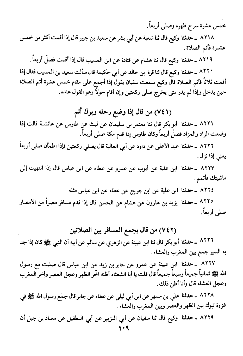8229 - حَدَّثَنَا وَكِيعٌ، قَالَ: ثنا سُفْيَانُ، عَنْ أَبِي الزُّبَيْرِ، عَنْ أَبِي الطُّفَيْلِ، عَنْ مُعَاذِ بْنِ جَبَلٍ، «أَنَّ النَّبِيَّ صَلَّى اللهُ عَلَيْهِ وَسَلَّمَ §جَمَعَ بَيْنَ الظُّهْرِ وَالْعَصْرِ، وَبَيْنَ الْمَغْرِبِ وَالْعِشَاءِ فِي السَّفَرِ فِي غَزْوَةِ تَبُوكَ»