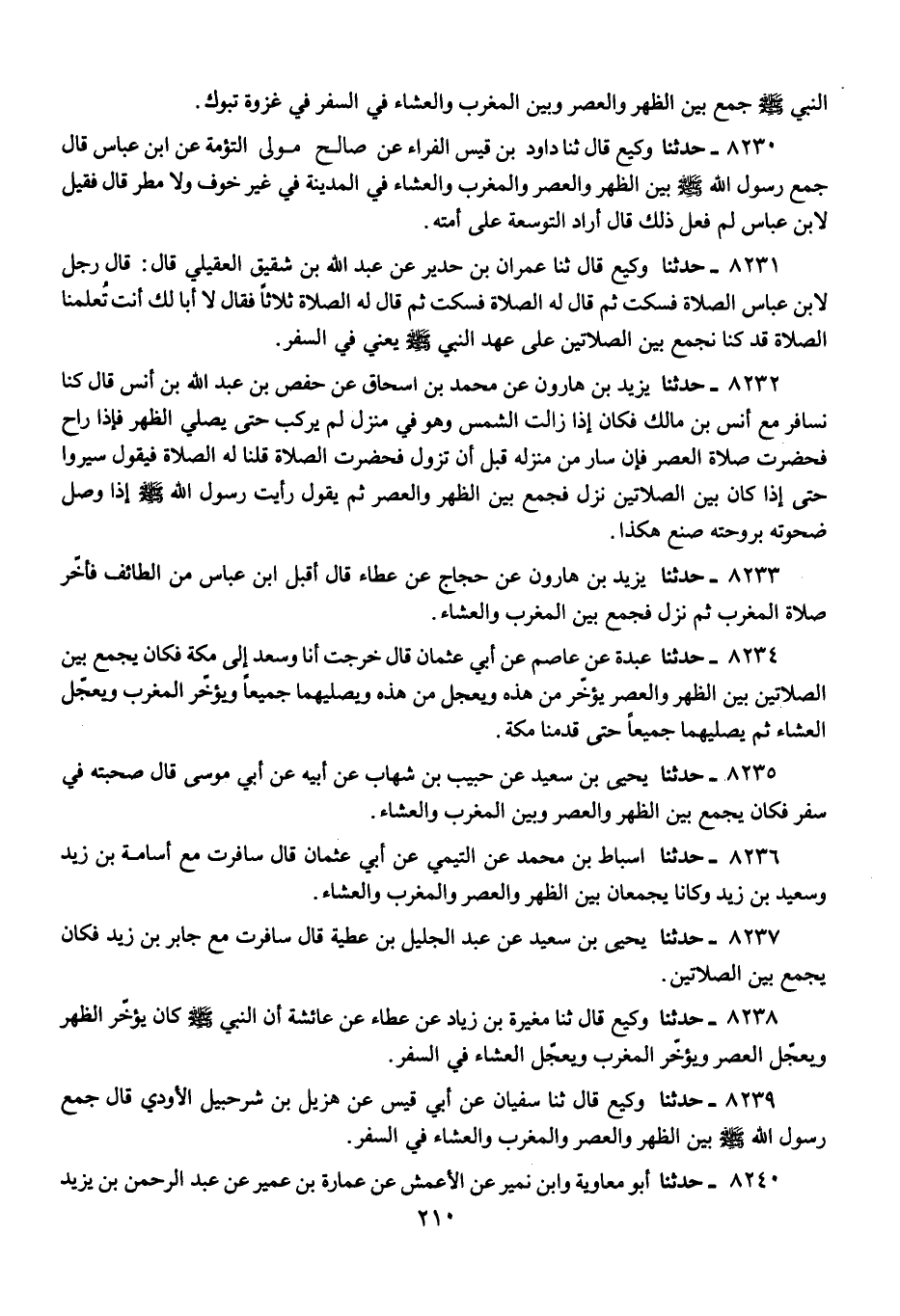 8236 - حَدَّثَنَا أَسْبَاطُ بْنُ مُحَمَّدٍ، عَنِ التَّيْمِيِّ، عَنْ أَبِي عُثْمَانَ، قَالَ: «سَافَرْتُ مَعَ أُسَامَةَ بْنِ زَيْدٍ، وَسَعِيدِ بْنِ زَيْدٍ وَكَانَا §يَجْمَعَانِ بَيْنَ الظُّهْرِ وَالْعَصْرِ، وَالْمَغْرِبِ وَالْعِشَاءِ»