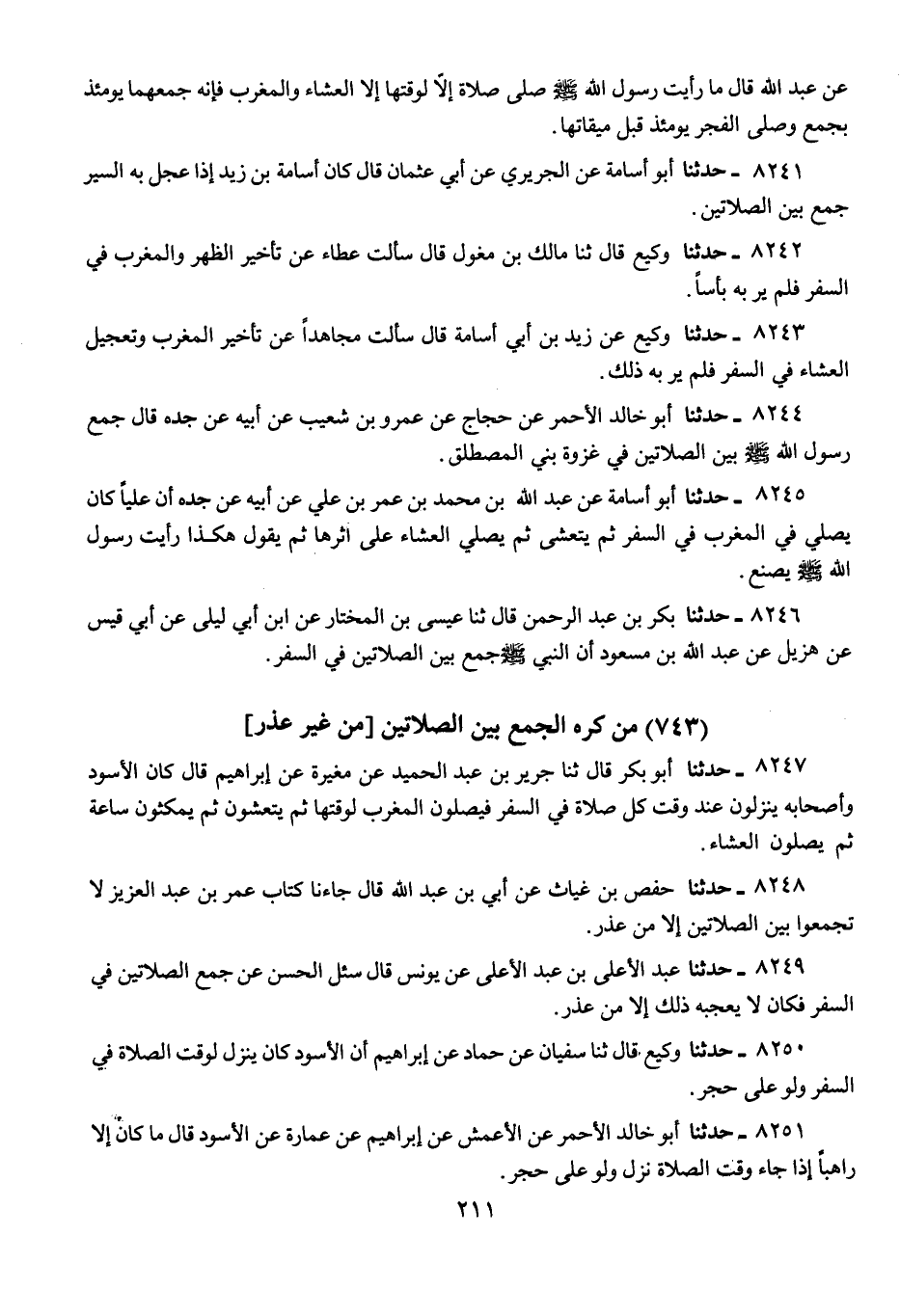 8247 - حَدَّثَنَا أَبُو بَكْرٍ قَالَ: ثنا جَرِيرُ بْنُ عَبْدِ الْحَمِيدِ، عَنْ مُغِيرَةَ، عَنْ إِبْرَاهِيمَ، قَالَ: «كَانَ الْأَسْوَدُ وَأَصْحَابُهُ §يَنْزِلُونَ عِنْدَ وَقْتِ كُلِّ صَلَاةٍ فِي السَّفَرِ، فَيُصَلُّونَ الْمَغْرِبَ لِوَقْتِهَا، ثُمَّ يَتَعَشَّوْنَ، ثُمَّ يَمْكُثُونَ سَاعَةً، ثُمَّ يُصَلُّونَ الْعِشَاءَ»