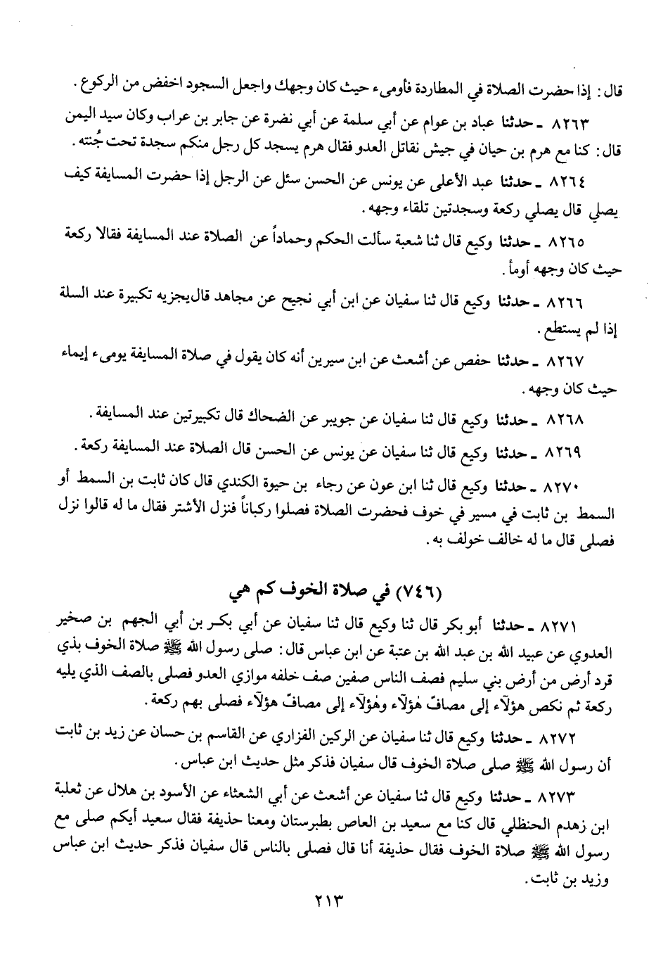 8269 - حَدَّثَنَا وَكِيعٌ، قَالَ: ثنا سُفْيَانُ، عَنْ يُونُسَ، عَنِ الْحَسَنِ، قَالَ: «§الصَّلَاةُ عِنْدَ الْمُسَايَفَةِ رَكْعَةٌ»