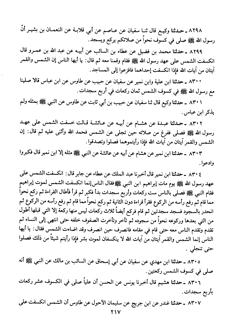 8300 - حَدَّثَنَا ابْنُ عُلَيَّةَ، وَابْنُ نُمَيْرٍ، عَنْ سُفْيَانَ، عَنْ حَبِيبٍ، عَنْ طَاوُسٍ، عَنِ ابْنِ عَبَّاسٍ، قَالَ: «§صَلَّيْنَا مَعَ رَسُولِ اللَّهِ صَلَّى اللهُ عَلَيْهِ وَسَلَّمَ فِي كُسُوفِ الشَّمْسِ ثَمَانِ رَكَعَاتٍ فِي أَرْبَعِ سَجَدَاتٍ»،