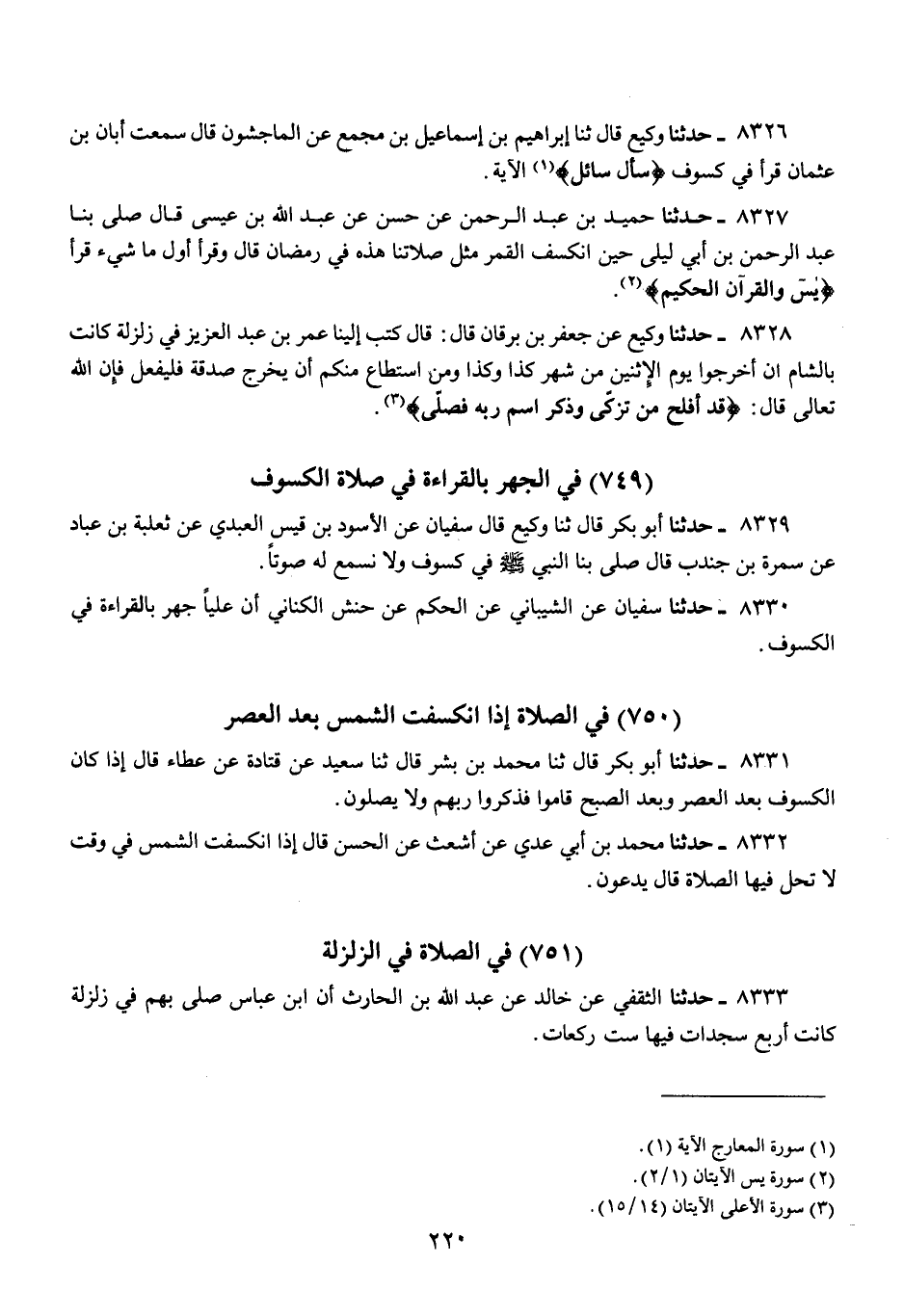 8326 - حَدَّثَنَا وَكِيعٌ، قَالَ: ثنا إِبْرَاهِيمُ بْنُ إِسْمَاعِيلَ بْنِ مُجَمِّعٍ، عَنِ الْمَاجِشُونِ، قَالَ: سَمِعْتُ أَبَانَ بْنَ عُثْمَانَ " §قَرَأَ فِي كُسُوفٍ: {سَأَلَ سَائِلٌ} [المعارج: 1] " الْآيَةَ