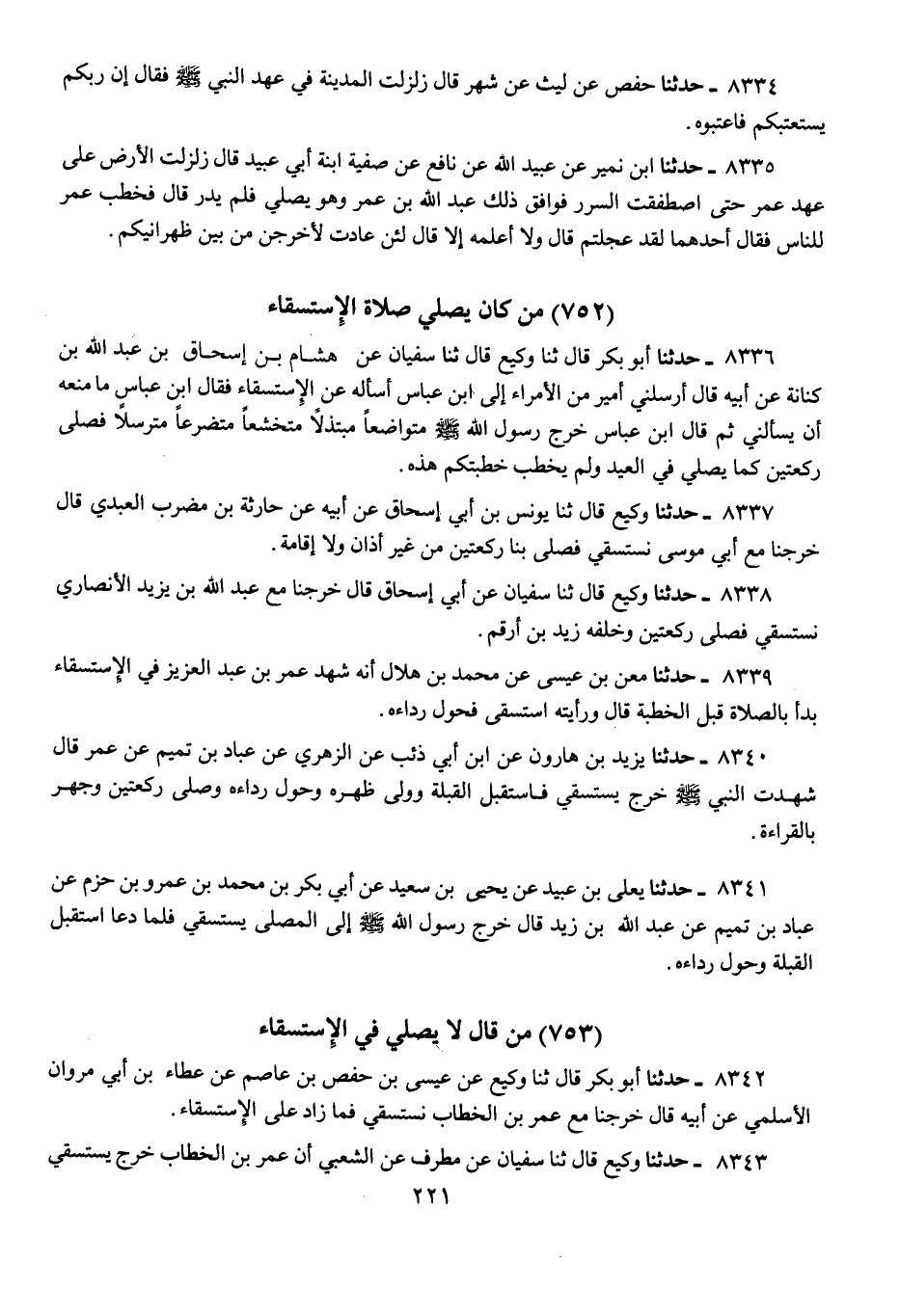 8338 - حَدَّثَنَا وَكِيعٌ، قَالَ: ثنا سُفْيَانُ، عَنْ أَبِي إِسْحَاقَ، قَالَ: «خَرَجْنَا مَعَ عَبْدِ اللَّهِ بْنِ يَزِيدَ الْأَنْصَارِيِّ §نَسْتَسْقِي فَصَلَّى رَكْعَتَيْنِ، وَخَلْفَهُ زَيْدُ بْنُ أَرْقَمَ»