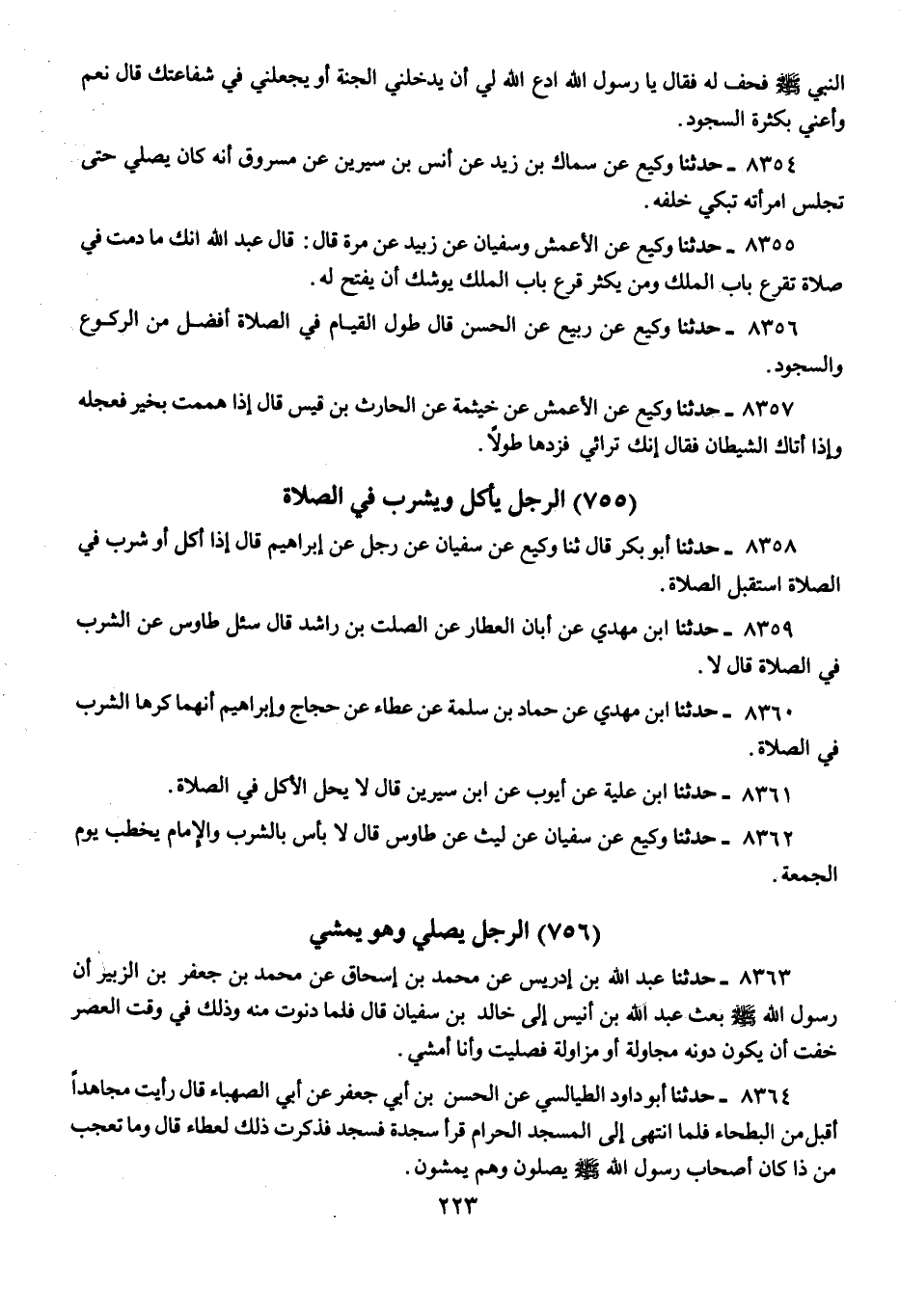 8359 - حَدَّثَنَا ابْنُ مَهْدِيٍّ، عَنْ أَبَانَ الْعَطَّارِ، عَنِ الصَّلْتِ بْنِ رَاشِدٍ، قَالَ: سُئِلَ طَاوُسٌ عَنْ §الشُّرْبِ فِي الصَّلَاةِ؟ قَالَ: «لَا»