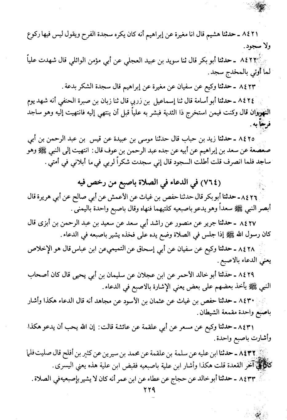 8423 - حَدَّثَنَا وَكِيعٌ، عَنْ سُفْيَانَ، عَنْ مُغِيرَةَ، عَنْ إِبْرَاهِيمَ، قَالَ: «§سَجْدَةُ الشُّكْرِ بِدْعَةٌ»