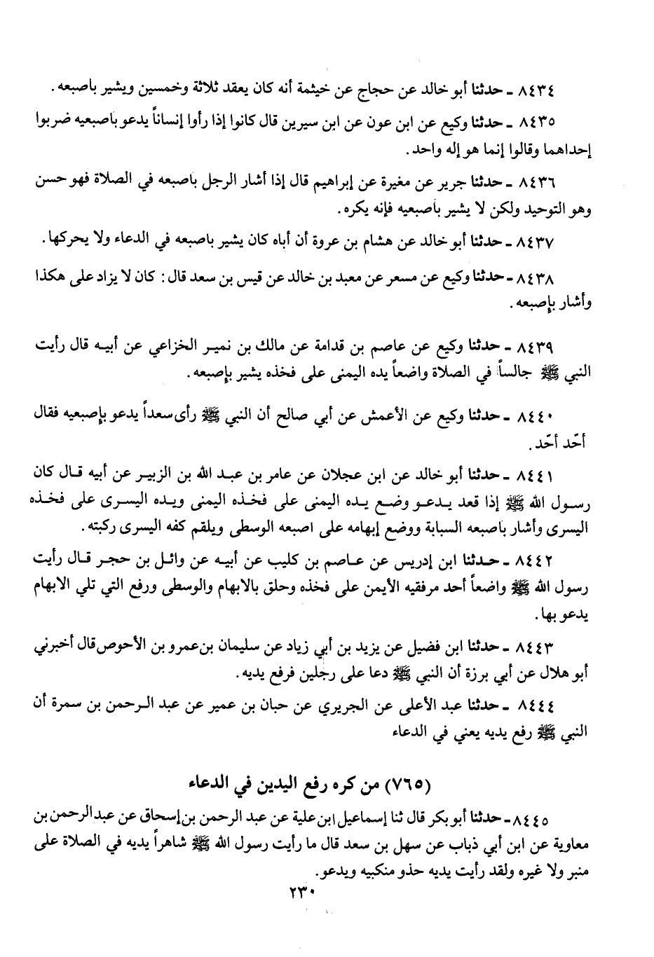 8437 - حَدَّثَنَا أَبُو خَالِدٍ، عَنْ هِشَامِ بْنِ عُرْوَةَ، «أَنَّ أَبَاهُ كَانَ §يُشِيرُ بِإِصْبَعِهِ فِي الدُّعَاءِ وَلَا يُحَرِّكُهَا»
