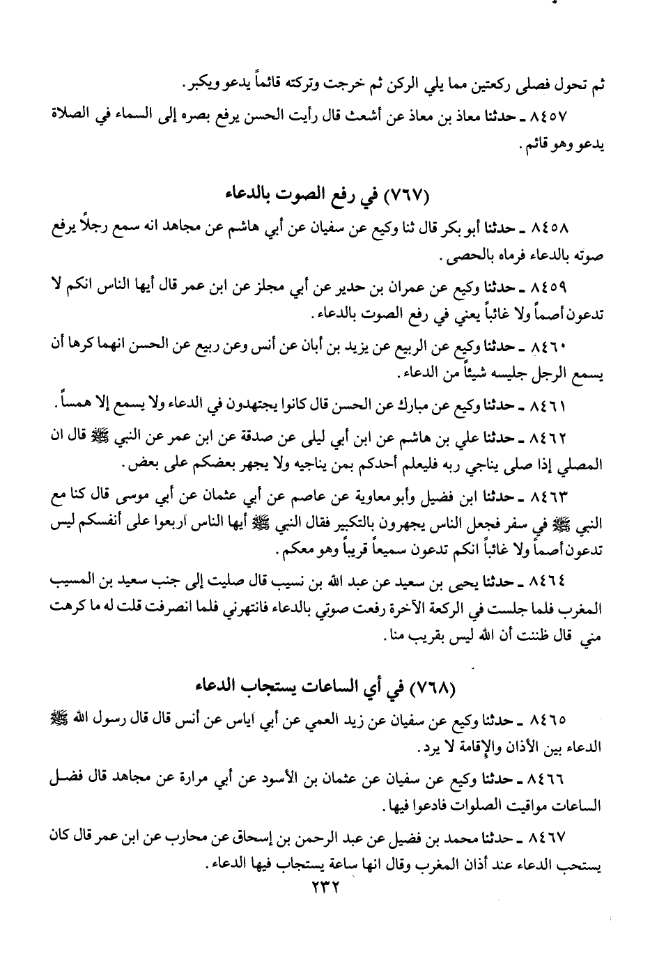 8458 - حَدَّثَنَا أَبُو بَكْرٍ قَالَ: ثنا وَكِيعٌ، عَنْ سُفْيَانَ، عَنْ أَبِي هَاشِمٍ، عَنْ مُجَاهِدٍ، «أَنَّهُ §سَمِعَ رَجُلًا يَرْفَعُ صَوْتَهُ بِالدُّعَاءِ فَرَمَاهُ بِالْحَصَى»