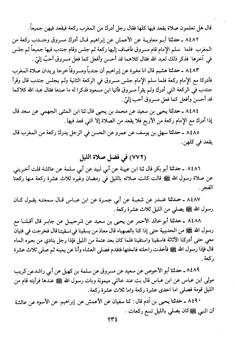 8490 - حَدَّثَنَا يَحْيَى بْنُ آدَمَ، قَالَ: ثنا سُفْيَانُ، عَنِ الْأَعْمَشِ، عَنْ إِبْرَاهِيمَ، عَنِ الْأَسْوَدِ، عَنْ عَائِشَةَ، «أَنَّ النَّبِيَّ صَلَّى اللهُ عَلَيْهِ وَسَلَّمَ كَانَ §يُصَلِّي بِاللَّيْلِ تِسْعَ رَكَعَاتٍ»