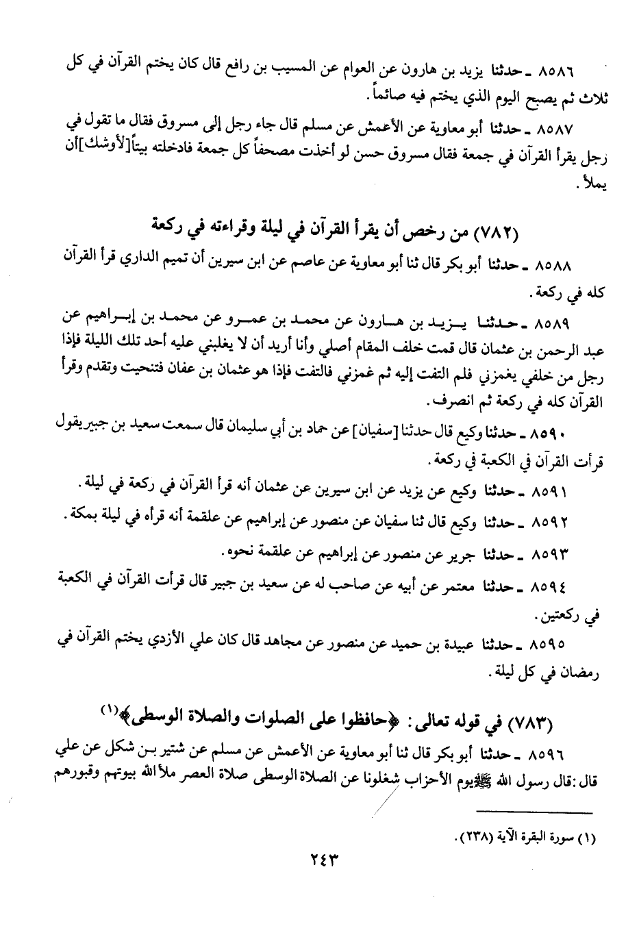 8588 - حَدَّثَنَا أَبُو بَكْرٍ قَالَ: ثنا أَبُو مُعَاوِيَةَ، عَنْ عَاصِمٍ، عَنِ ابْنِ سِيرِينَ، «أَنَّ تَمِيمًا الدَّارِيَّ §قَرَأَ الْقُرْآنَ كُلَّهُ فِي رَكْعَةٍ»