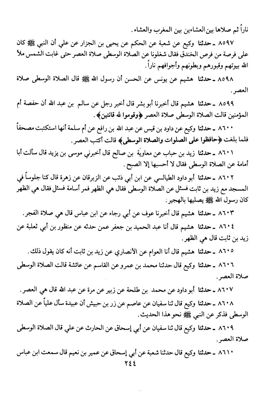 8610 - حَدَّثَنَا وَكِيعٌ، قَالَ: حَدَّثَنَا شُعْبَةُ، عَنْ أَبِي إِسْحَاقَ، عَنْ عُمَيْرِ بْنِ نُعَيْمٍ، قَالَ: سَمِعْتُ ابْنَ عَبَّاسٍ، يَقُولُ: {حَافِظُوا عَلَى الصَّلَوَاتِ وَالصَّلَاةِ الْوُسْطَى} [البقرة: 238]: «§صَلَاةِ الْعَصْرِ»