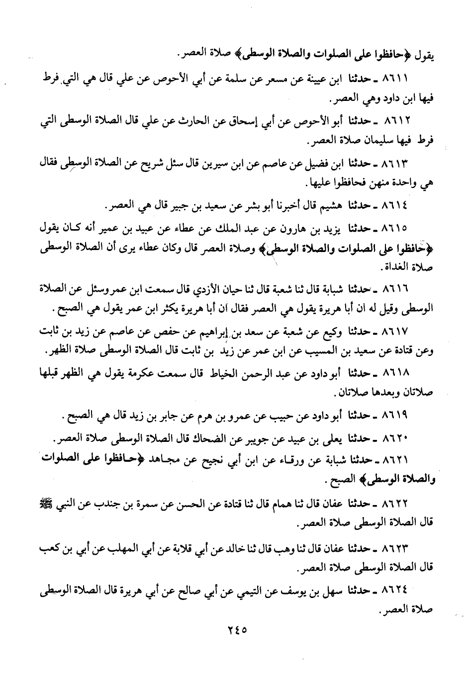 8611 - حَدَّثَنَا ابْنُ عُيَيْنَةَ، عَنْ مِسْعَرٍ، عَنْ سَلَمَةَ، عَنْ أَبِي الْأَحْوَصِ، عَنْ عَلِيٍّ، قَالَ: «§هِيَ الَّتِي فَرَّطَ فِيهَا ابْنُ دَاوُدَ وَهِيَ الْعَصْرُ»