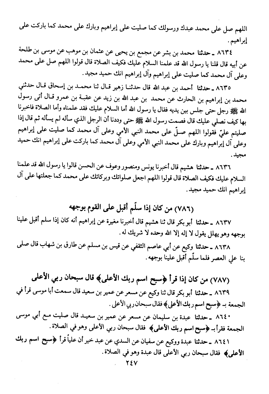 8634 - حَدَّثَنَا مُحَمَّدُ بْنُ بِشْرٍ، عَنْ مُجَمِّعِ بْنِ يَحْيَى، عَنْ عُثْمَانَ بْنِ مَوْهَبٍ، عَنْ مُوسَى بْنِ طَلْحَةَ، عَنْ أَبِيهِ، قَالَ: قُلْنَا: يَا رَسُولَ اللَّهِ قَدْ عَلِمْنَا السَّلَامَ عَلَيْكَ، فَكَيْفَ الصَّلَاةُ؟ قَالَ: " قُولُوا: §اللَّهُمَّ صَلِّ عَلَى مُحَمَّدٍ، وَعَلَى آلِ مُحَمَّدٍ، كَمَا صَلَّيْتَ عَلَى إِبْرَاهِيمَ، وَآلِ إِبْرَاهِيمَ، إِنَّكَ حَمِيدٌ مَجِيدٌ "