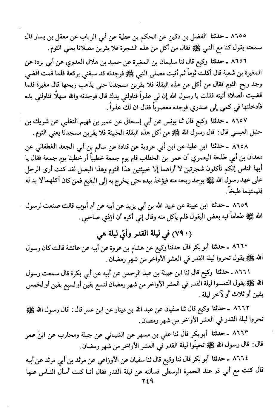 8662 - حَدَّثَنَا وَكِيعٌ، قَالَ: ثنا سُفْيَانُ، عَنْ عَبْدِ اللَّهِ بْنِ دِينَارٍ، عَنِ ابْنِ عُمَرَ قَالَ: قَالَ رَسُولُ اللَّهِ صَلَّى اللهُ عَلَيْهِ وَسَلَّمَ: «§تَحَرَّوْا لَيْلَةَ الْقَدْرِ فِي الْعَشْرِ الْأَوَاخِرِ مِنْ شَهْرِ رَمَضَانَ»