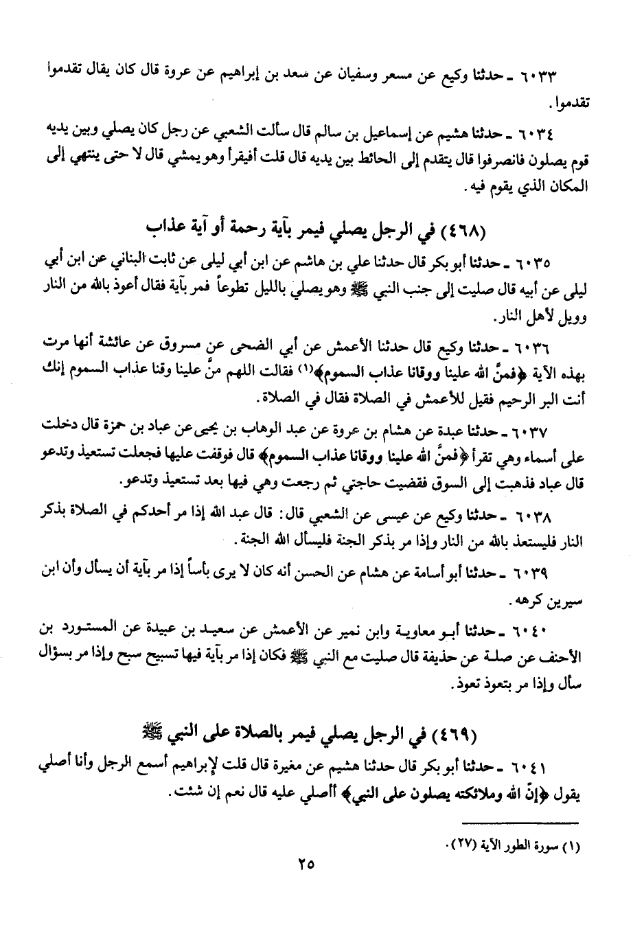 6038 - حَدَّثَنَا وَكِيعٌ، عَنْ عِيسَى، عَنِ الشَّعْبِيِّ، قَالَ: قَالَ عَبْدُ اللَّهِ: «§إِذَا مَرَّ أَحَدُكُمْ فِي الصَّلَاةِ بِذِكْرِ النَّارِ، فَلْيَسْتَعِذْ بِاللَّهِ مِنَ النَّارِ، وَإِذَا مَرَّ بِذِكْرِ الْجَنَّةِ، فَلْيَسْأَلِ اللَّهَ الْجَنَّةَ»