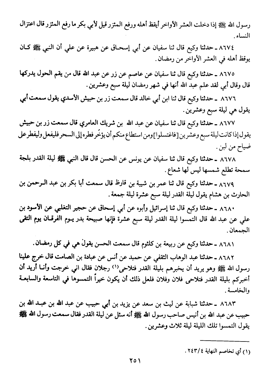 8675 - حَدَّثَنَا وَكِيعٌ، قَالَ: ثنا سُفْيَانُ، عَنْ عَاصِمٍ، عَنْ زِرٍّ، عَنْ عَبْدِ اللَّهِ، قَالَ: «§مَنْ يَقُمْ الْحَوْلَ يُدْرِكْهَا» قَالَ: وَقَالَ أُبَيٌّ: «لَقَدْ عَلِمَ عَبْدُ اللَّهِ أَنَّهَا فِي شَهْرِ رَمَضَانَ لَيْلَةَ سَبْعٍ وَعِشْرِينَ»