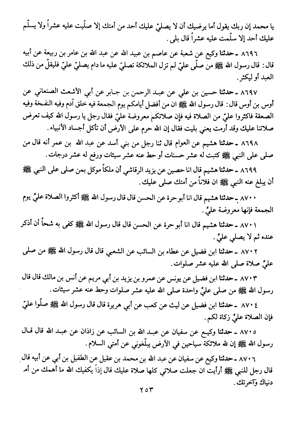 8699 - حَدَّثَنَا هُشَيْمٌ، قَالَ: أَنَا حُصَيْنٌ، عَنْ يَزِيدَ الرَّقَاشِيِّ، «إِنَّ §مَلَكًا مُوَكَّلٌ بِمَنْ صَلَّى عَلَى النَّبِيِّ صَلَّى اللهُ عَلَيْهِ وَسَلَّمَ، أَنْ يُبَلِّغَ عَنْهُ النَّبِيَّ صَلَّى اللهُ عَلَيْهِ وَسَلَّمَ إِنَّ فُلَانًا مِنْ أُمَّتِكَ صَلَّى عَلَيْكَ»