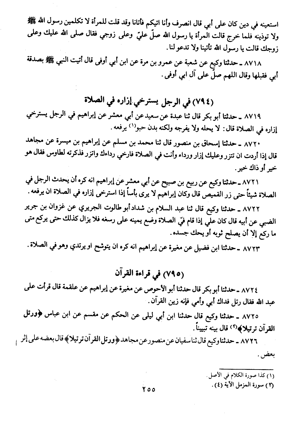 8719 - حَدَّثَنَا أَبُو بَكْرٍ قَالَ: ثنا عَبْدَةُ، عَنْ سَعْدٍ، عَنْ أَبِي مَعْشَرٍ، عَنْ إِبْرَاهِيمَ، فِي الرَّجُلِ يَسْتَرْخِي إِزَارُهُ فِي الصَّلَاةِ، قَالَ: «§لَا يَحِلُّهُ، وَلَا يُفَرِّجُهُ، وَلَكِنَّهُ يُدْرِجُهُ، وَيَرْفَعُهُ»