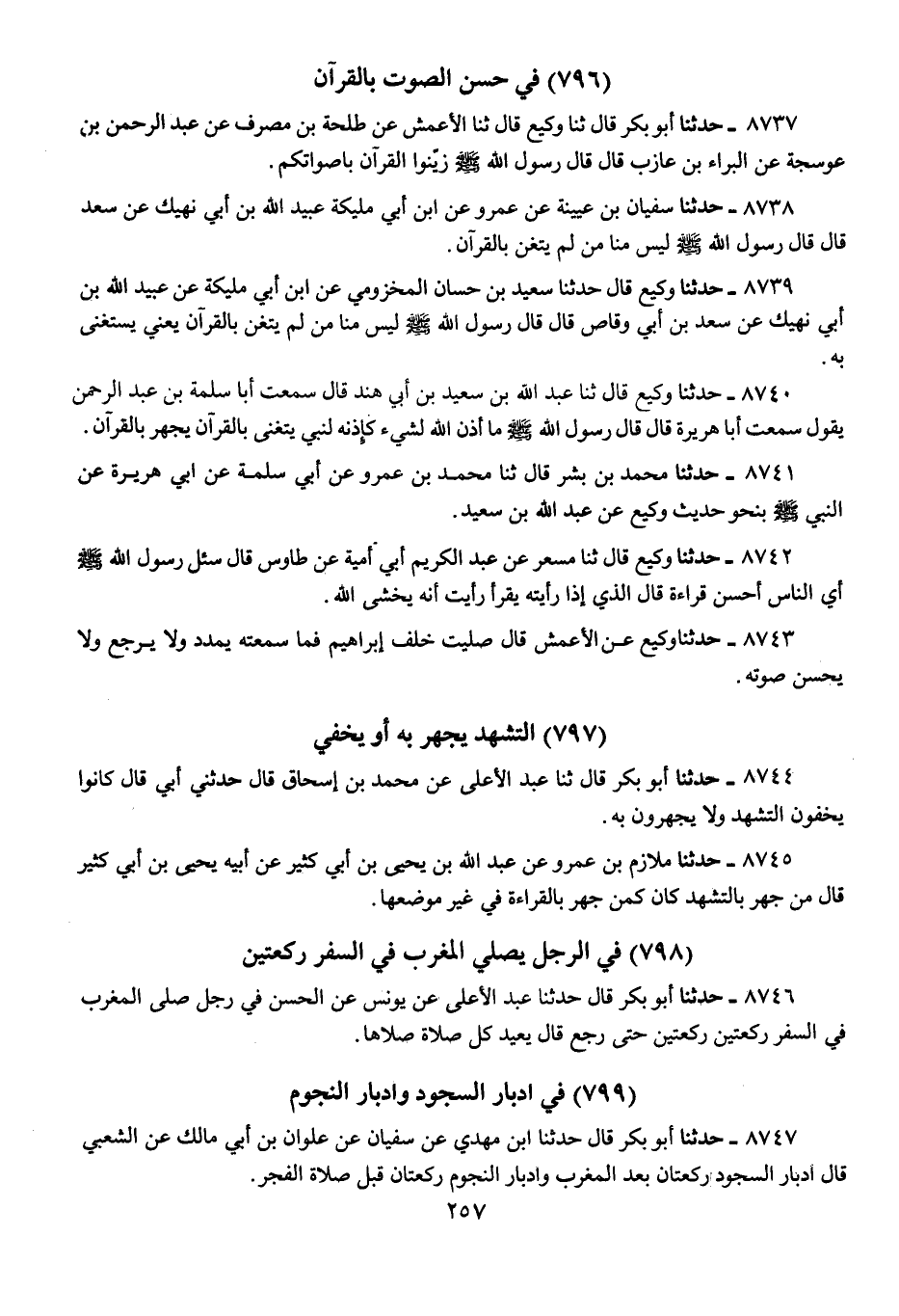 8743 - حَدَّثَنَا وَكِيعٌ، عَنِ الْأَعْمَشِ، قَالَ: «صَلَّيْتُ خَلْفَ إِبْرَاهِيمَ §فَمَا سَمِعْتُهُ يُمَدِّدُ، وَلَا يُرَجِّعُ، وَلَا يُحَسِّنُ صَوْتَهُ»