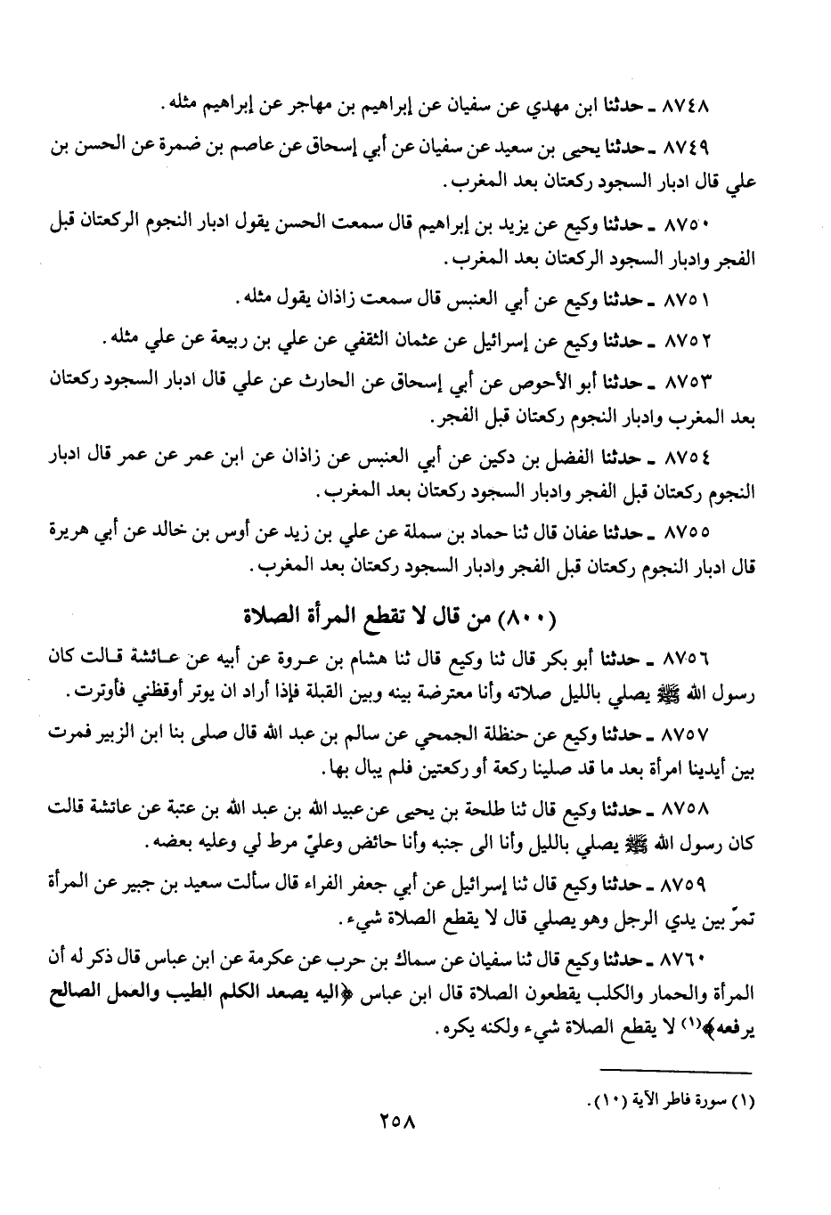 8760 - حَدَّثَنَا وَكِيعٌ، قَالَ: ثنا سُفْيَانُ، عَنْ سِمَاكِ بْنِ حَرْبٍ، عَنْ عِكْرِمَةَ، عَنِ ابْنِ عَبَّاسٍ، قَالَ: ذُكِرَ لَهُ أَنَّ الْمَرْأَةَ، وَالْحِمَارَ، وَالْكَلْبَ، يَقْطَعُونَ الصَّلَاةَ، قَالَ ابْنُ عَبَّاسٍ: «إِلَيْهِ يَصْعَدُ الْكَلِمُ الطَّيِّبُ، وَالْعَمَلُ الصَّالِحُ يَرْفَعُهُ، §لَا يَقْطَعُ الصَّلَاةَ شَيْءٌ، وَلَكِنَّهُ يُكْرَهُ»