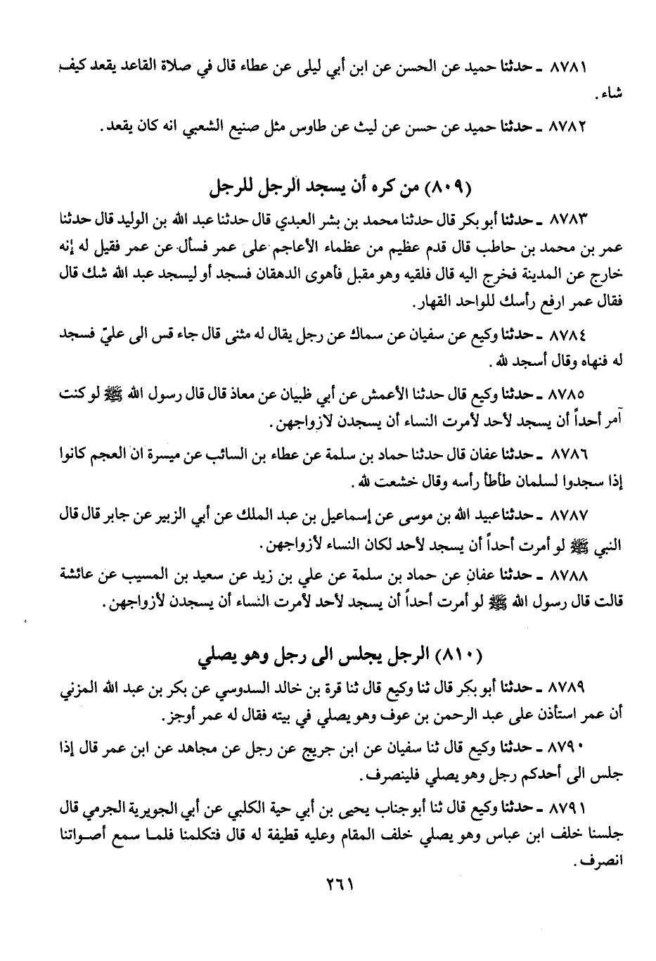 8785 - حَدَّثَنَا وَكِيعٌ، قَالَ: حَدَّثَنَا الْأَعْمَشُ، عَنْ أَبِي ظَبْيَانَ، عَنْ مُعَاذٍ، قَالَ: قَالَ رَسُولُ اللَّهِ صَلَّى اللهُ عَلَيْهِ وَسَلَّمَ: «§لَوْ كُنْتُ آمِرًا أَحَدًا أَنْ يَسْجُدَ لِأَحَدٍ لَأَمَرْتُ النِّسَاءَ أَنْ يَسْجُدْنَ لِأَزْوَاجِهِنَّ»