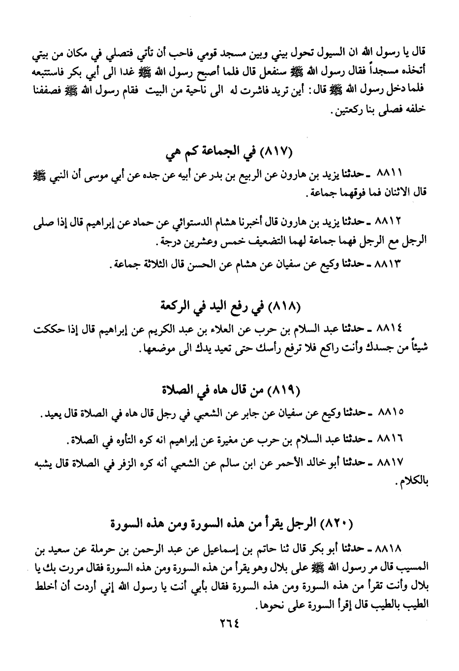 8813 - حَدَّثَنَا وَكِيعٌ، عَنْ سُفْيَانَ، عَنْ هِشَامٍ، عَنِ الْحَسَنِ، قَالَ: «§الثَّلَاثَةُ جَمَاعَةٌ»