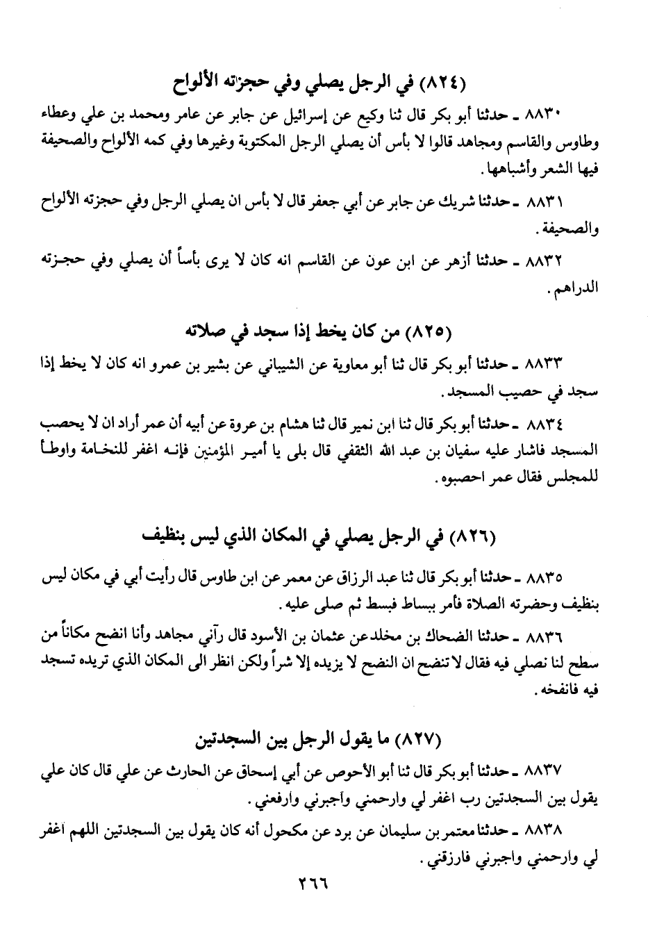 8833 - حَدَّثَنَا أَبُو بَكْرٍ قَالَ: ثنا أَبُو مُعَاوِيَةَ، عَنِ الشَّيْبَانِيِّ، عَنْ بَشِيرِ بْنِ عَمْرٍو، «أَنَّهُ كَانَ §لَا يَخُطُّ إِذَا سَجَدَ فِي حَصِيبِ الْمَسْجِدِ»