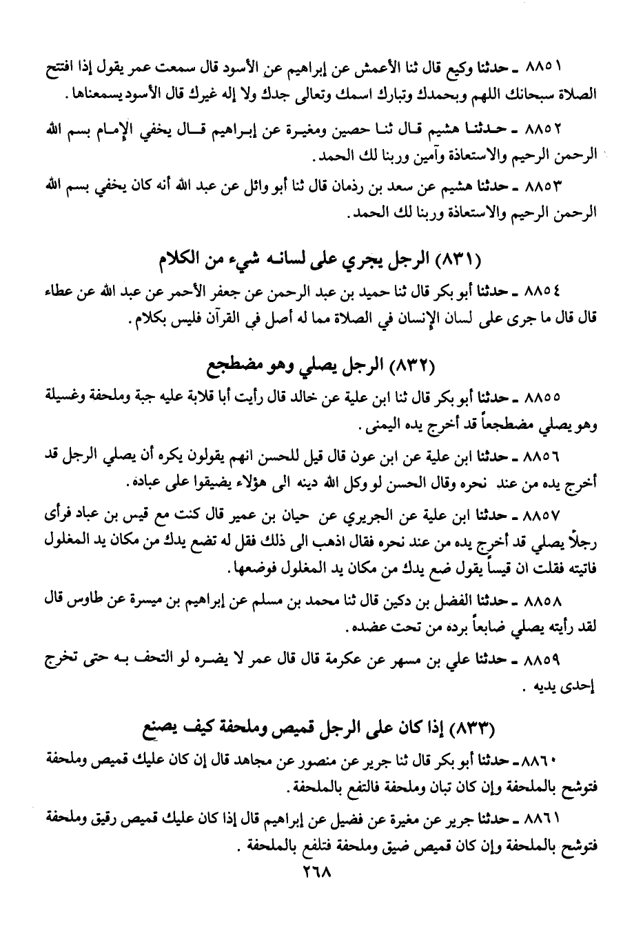 8855 - حَدَّثَنَا أَبُو بَكْرٍ قَالَ: ثنا ابْنُ عُلَيَّةَ، عَنْ خَالِدٍ، قَالَ: «رَأَيْتُ أَبَا قِلَابَةَ §عَلَيْهِ جُبَّةٌ، وَمِلْحَفَةٌ، وَغَسِيلَةٌ وَهُوَ يُصَلِّي مُضْطَجِعًا، قَدْ أَخْرَجَ يَدَهُ الْيُمْنَى»