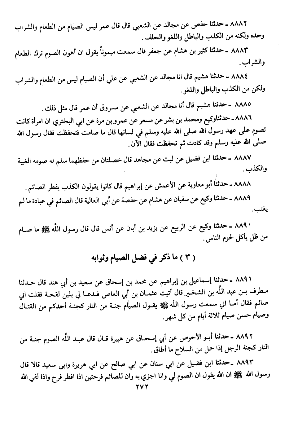 8891 - حَدَّثَنَا إِسْمَاعِيلُ بْنُ إِبْرَاهِيمَ، عَنْ مُحَمَّدِ بْنِ إِسْحَاقَ، عَنْ سَعِيدِ بْنِ أَبِي هِنْدٍ، قَالَ: حَدَّثَنَا مُطَرِّفُ بْنُ عَبْدِ اللَّهِ بْنِ الشِّخِّيرِ، قَالَ: أَتَيْتُ عُثْمَانَ بْنَ أَبِي الْعَاصِ فَدَعَا لِي بِلَبَنِ لَقْحَةٍ، فَقُلْتُ: إِنِّي صَائِمٌ، فَقَالَ: أَمَا إِنِّي سَمِعْتُ رَسُولَ اللَّهِ صَلَّى اللهُ عَلَيْهِ وَسَلَّمَ يَقُولُ: «§الصِّيَامُ جُنَّةٌ مِنَ النَّارِ، كَجُنَّةِ أَحَدِكُمْ مِنَ الْقِتَالِ، وَصِيَامٌ حَسَنٌ، صِيَامُ ثَلَاثَةِ أَيَّامٍ مِنْ كُلِّ شَهْرٍ»