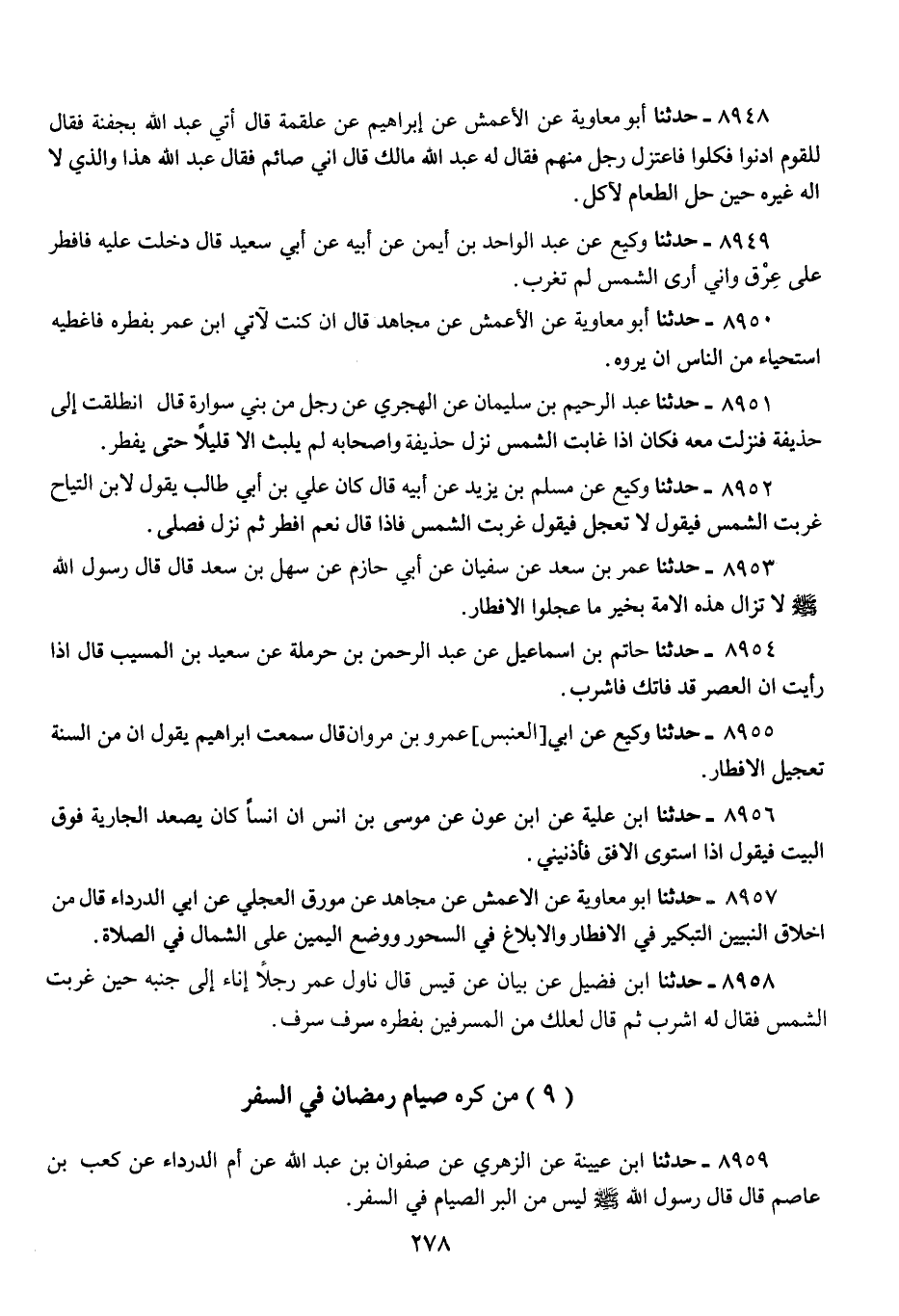 8951 - حَدَّثَنَا عَبْدُ الرَّحِيمِ بْنُ سُلَيْمَانَ، عَنِ الْهَجَرِيِّ، عَنْ رَجُلٍ، مِنْ بَنِي سَوَّارَةَ، قَالَ: «انْطَلَقْتُ إِلَى حُذَيْفَةَ، فَنَزَلْتُ مَعَهُ، فَكَانَ §إِذَا غَابَتِ الشَّمْسُ، نَزَلَ حُذَيْفَةُ، وَأَصْحَابُهُ لَمْ يَلْبَثْ إِلَّا قَلِيلًا حَتَّى يُفْطِرَ»
