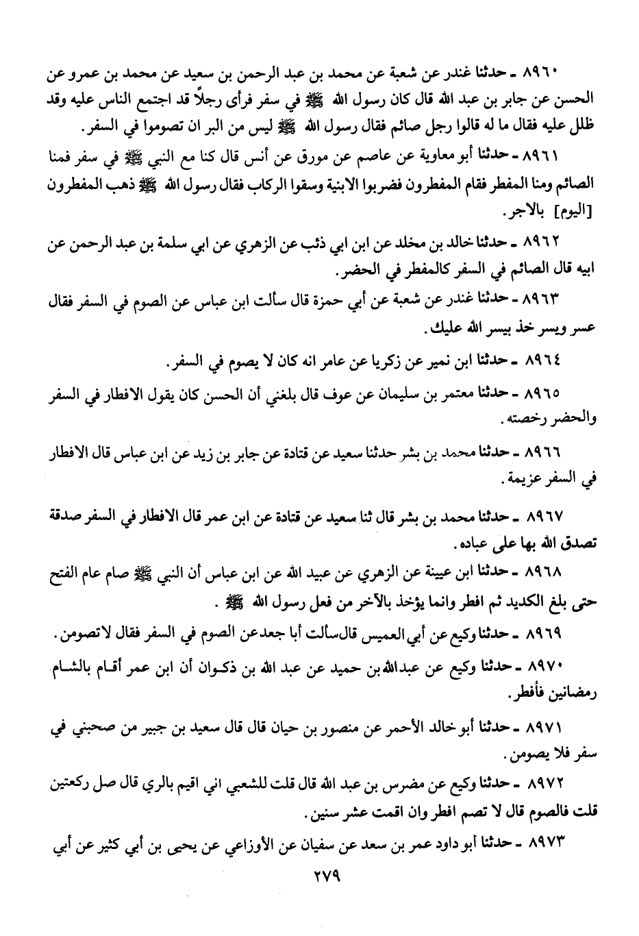 8964 - حَدَّثَنَا ابْنُ نُمَيْرٍ، عَنْ زَكَرِيَّا، عَنْ عَامِرٍ، «أَنَّهُ كَانَ §لَا يَصُومُ فِي السَّفَرِ»