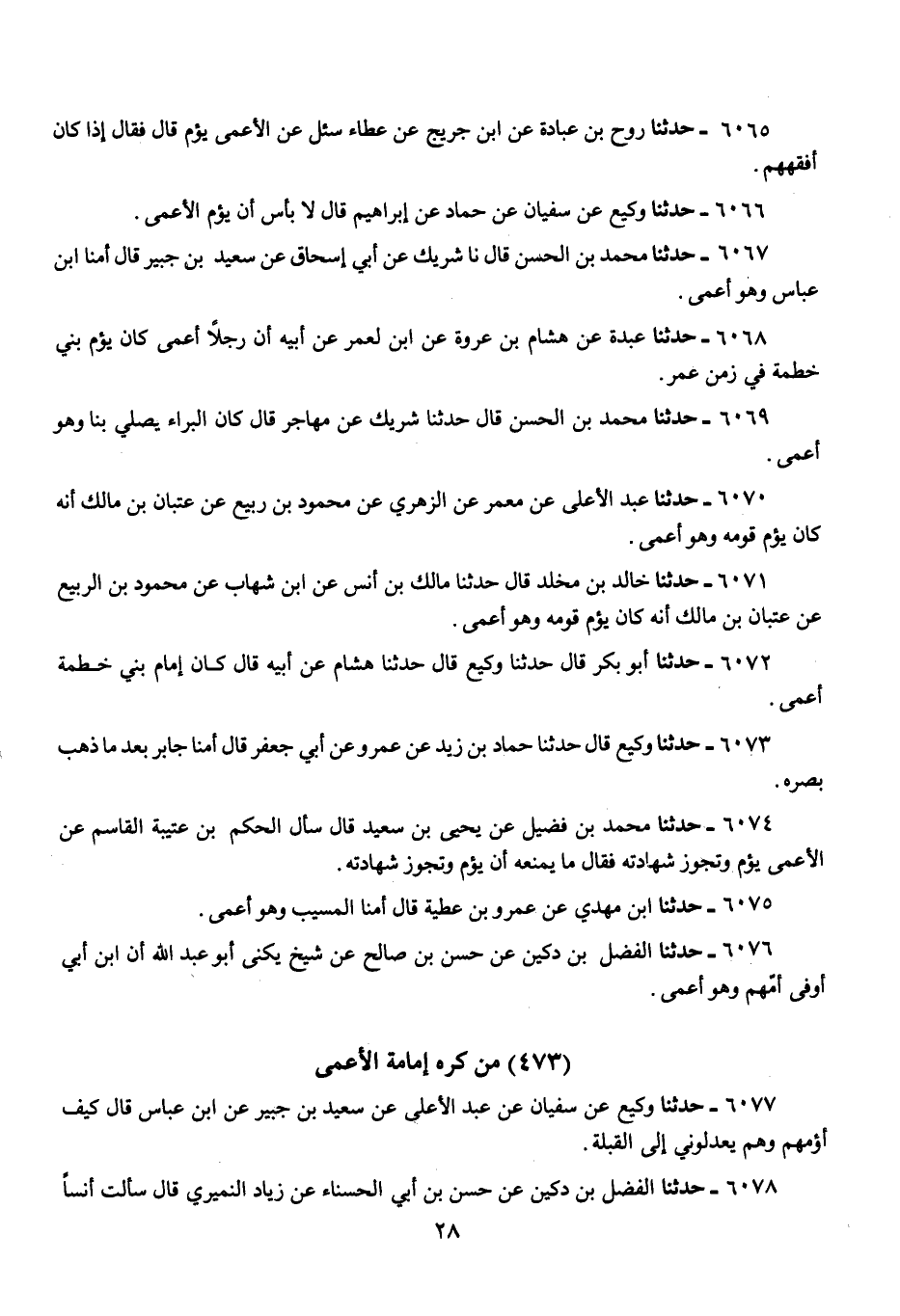 6066 - حَدَّثَنَا وَكِيعٌ، عَنْ سُفْيَانَ، عَنْ حَمَّادٍ، عَنْ إِبْرَاهِيمَ، قَالَ: «§لَا بَأْسَ أَنْ يَؤُمَّ الْأَعْمَى»