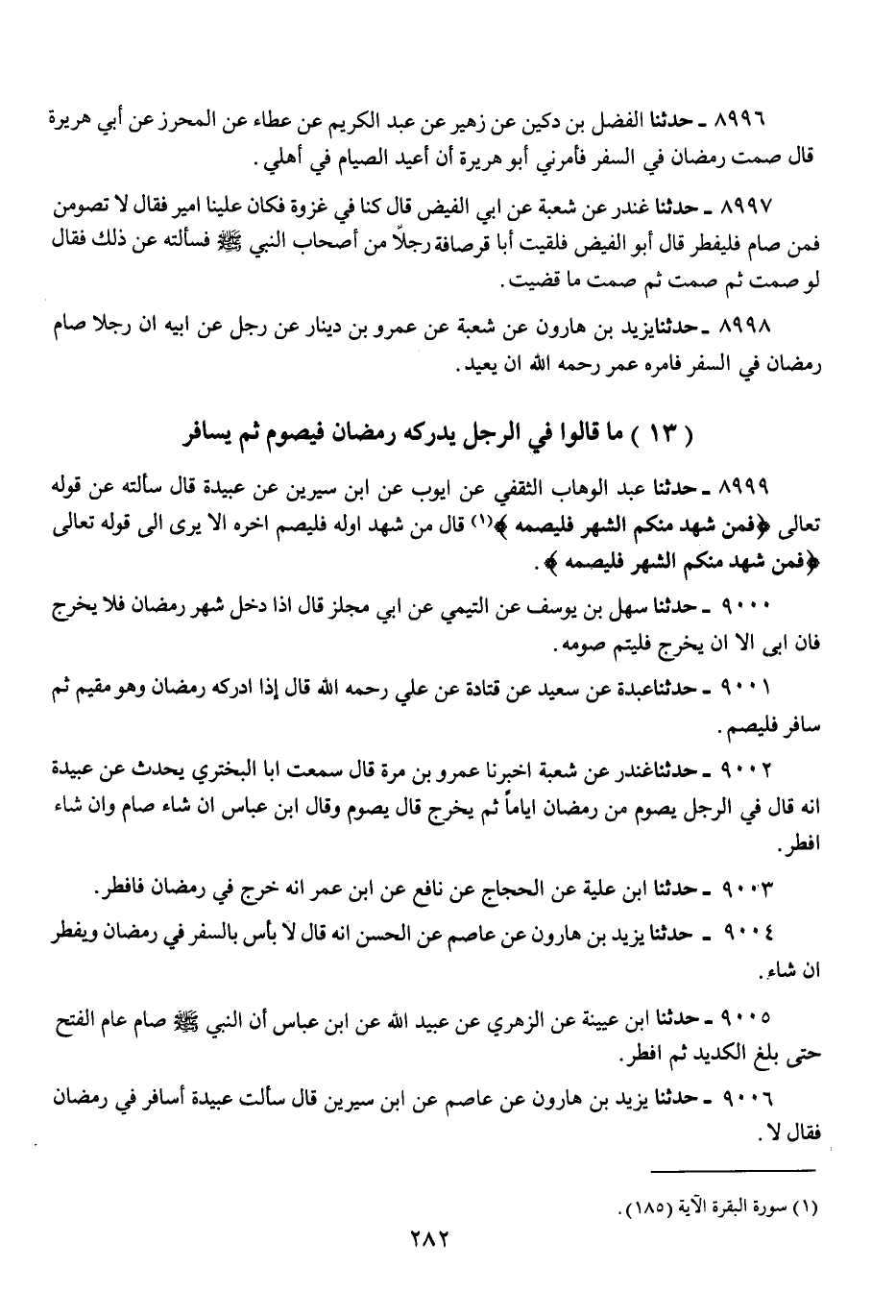 8999 - حَدَّثَنَا عَبْدُ الْوَهَّابِ الثَّقَفِيُّ، عَنْ أَيُّوبَ، عَنِ ابْنِ سِيرِينَ، عَنْ عَبِيدَةَ، قَالَ: سَأَلْتُهُ عَنْ قَوْلِهِ تَعَالَى: {فَمَنْ شَهِدَ مِنْكُمُ الشَّهْرَ فَلْيَصُمْهُ} [البقرة: 185]، قَالَ: " §مَنْ شَهِدَ أَوَّلَهُ، فَلْيَصُمْ آخِرَهُ، أَلَا يَرَى إِلَى قَوْلِهِ تَعَالَى: {فَمَنْ شَهِدَ مِنْكُمُ الشَّهْرَ فَلْيَصُمْهُ} [البقرة: 185] "