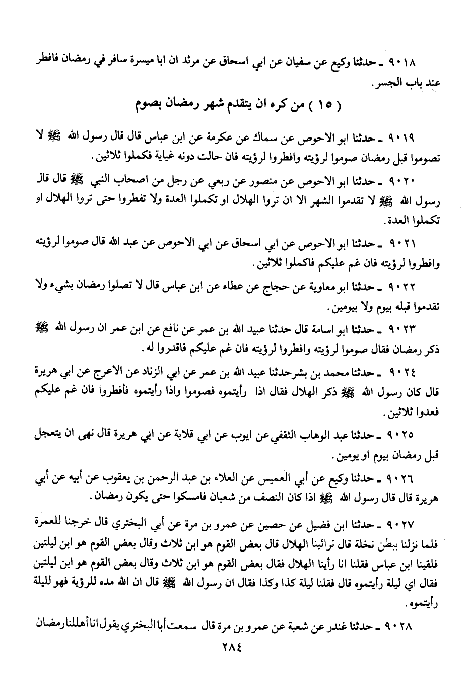 9026 - حَدَّثَنَا وَكِيعٌ، عَنْ أَبِي الْعُمَيْسِ، عَنِ الْعَلَاءِ بْنِ عَبْدِ الرَّحْمَنِ بْنِ يَعْقُوبَ، عَنْ أَبِيهِ، عَنْ أَبِي هُرَيْرَةَ، قَالَ: قَالَ رَسُولُ اللَّهِ صَلَّى اللهُ عَلَيْهِ وَسَلَّمَ: «§إِذَا كَانَ النِّصْفُ مِنْ شَعْبَانَ، فَأَمْسِكُوا حَتَّى يَكُونَ رَمَضَانُ»