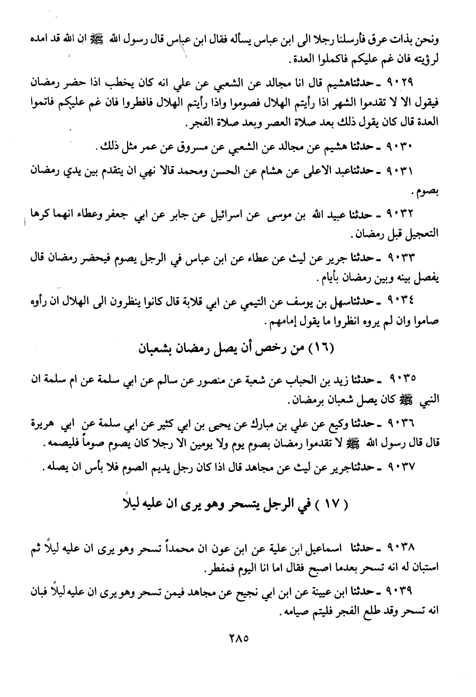 9029 - حَدَّثَنَا هُشَيْمٌ، قَالَ: أَنَا مُجَالِدٌ، عَنِ الشَّعْبِيِّ، عَنْ عَلِيٍّ، أَنَّهُ كَانَ يَخْطُبُ إِذَا حَضَرَ رَمَضَانُ، فَيَقُولُ: «§أَلَا لَا تَقَدَّمُوا الشَّهْرَ إِذَا رَأَيْتُمُ الْهِلَالَ فَصُومُوا، وَإِذَا رَأَيْتُمُ الْهِلَالَ فَأَفْطِرُوا، فَإِنْ غُمَّ عَلَيْكُمْ فَأَتِمُّوا الْعِدَّةَ»، قَالَ: كَانَ يَقُولُ ذَلِكَ بَعْدَ صَلَاةِ الْعَصْرِ، وَبَعْدَ صَلَاةِ الْفَجْرِ،