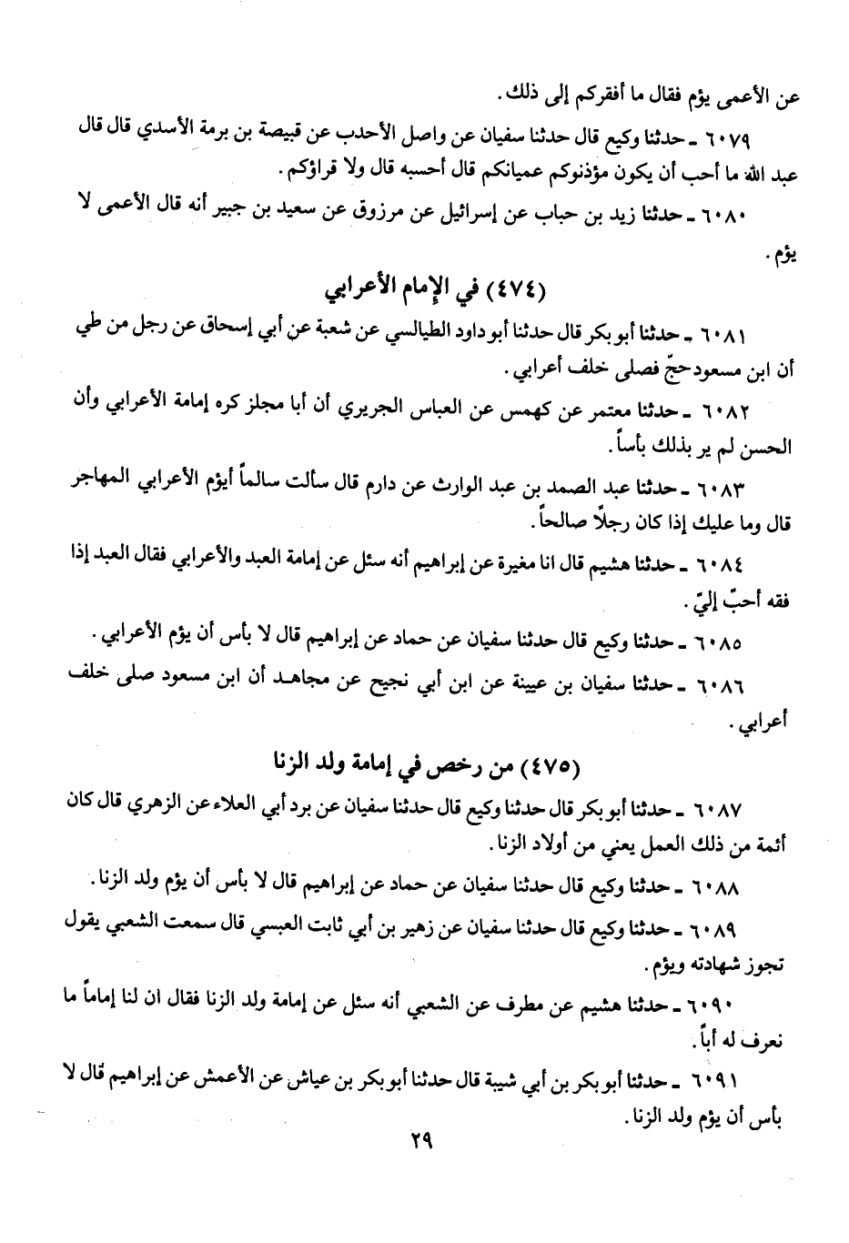 6088 - حَدَّثَنَا وَكِيعٌ، قَالَ: حَدَّثَنَا سُفْيَانُ، عَنْ حَمَّادٍ، عَنْ إِبْرَاهِيمَ، قَالَ: «§لَا بَأْسَ أَنْ يَؤُمَّ وَلَدُ الزِّنَا»