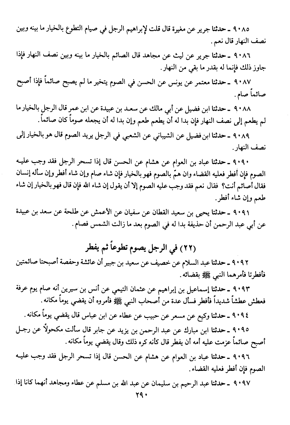 9089 - حَدَّثَنَا ابْنُ فُضَيْلٍ، عَنِ الشَّيْبَانِيِّ، عَنِ الشَّعْبِيِّ، فِي الرَّجُلِ يُرِيدُ الصَّوْمَ، قَالَ: «§هُوَ بِالْخِيَارِ إِلَى نِصْفِ النَّهَارِ»