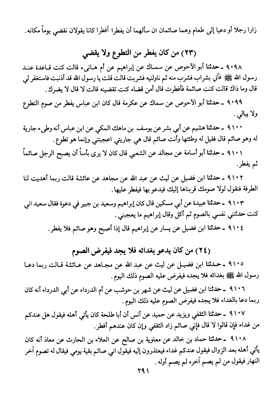 9105 - حَدَّثَنَا ابْنُ فُضَيْلٍ، عَنْ لَيْثٍ، عَنْ عَبْدِ اللَّهِ، عَنْ مُجَاهِدٍ، عَنْ عَائِشَةَ، قَالَتْ: «§رُبَّمَا دَعَا رَسُولُ اللَّهِ صَلَّى اللهُ عَلَيْهِ وَسَلَّمَ بِغَدَائِهِ فَلَا يَجِدُهُ، فَيَفْرِضُ عَلَيْهِ الصَّوْمَ ذَلِكَ الْيَوْمَ»
